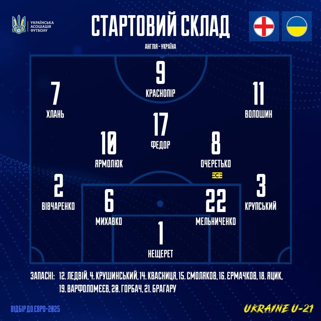 Украины U-21: Нещерет – Крупский, Мельниченко, Михавко, Овчаренко – Очеретько, Ярмолюк – Федор – Волошин, Краснопир, Хлань.
