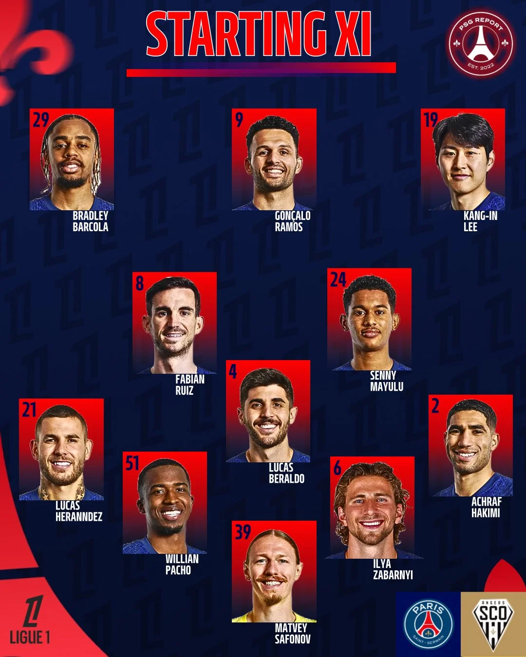 Стартовый состав ПСЖ: Сафонов, Хакими, Забарный, Пачо, Л. Эрнандес – Беральдо, Ф. Руис, Заир-Эмери – Ли, Рамуш, Барколя