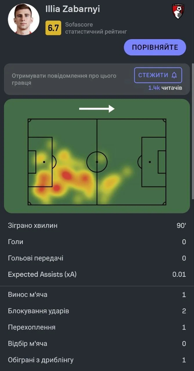 Еще несколько дальних выстрелов Марсьяля, Каземиро, Эриксена и Шоу. Забарный заблокировал выстрел Ван-Биссаки, который вырвался в штрафную. Однако в целом экс-динамовец не впечатлил. Лишь по одному выигранному единоборству, перехвату, блоку и восстановлению контроля мяча. Позволил себя пройти на дриблинге, заработал штрафной на чужой половине, но плоховато продвигал мяч на чужую половину. В то же время Борнмут со временем оправился и нанес практически втрое больше ударов из пределов штрафной, чем МЮ (5:2).