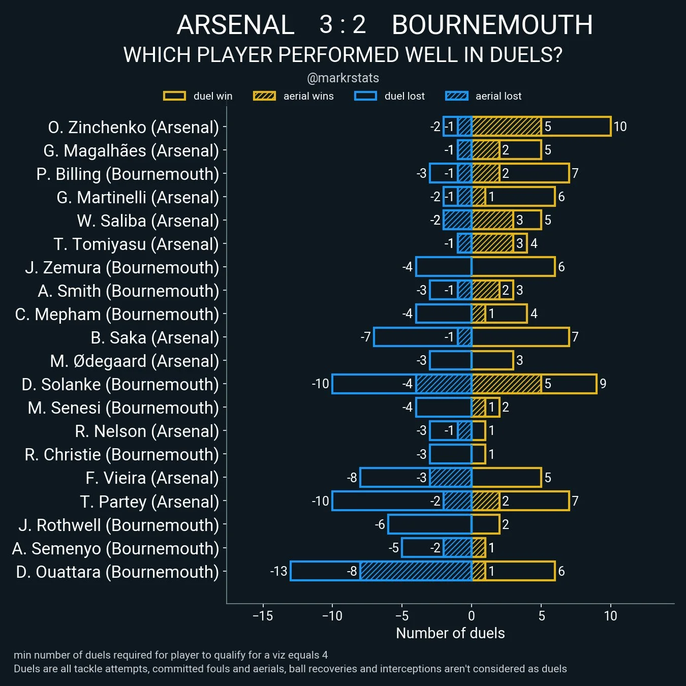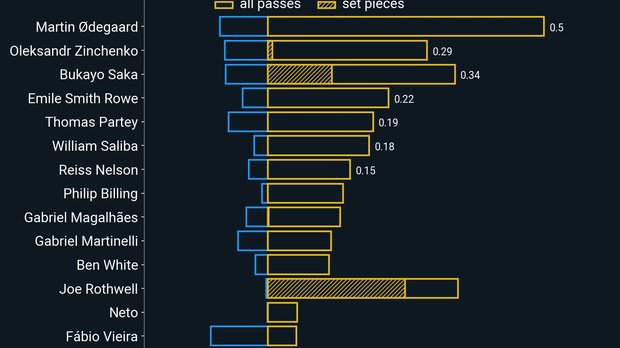 Взрывное начало поединка. Гости разыграли с центра поля и всей командой рванули в финальную треть. Зинченко пассивно в отборе против Уттара, Габриэл пропускает под ногой пас на Биллинга, против которого вообще никто не играет – 0:1. Экс-голкипер Барселоны Нету тащит 3 подряд удара. Эдегор (дважды) и Сака пробивали. Особенно впечатляющим был сейв после удара Букайо на добивании с нескольких метров. Этот момент потянул даже на больший xG, чем гол Биллинга.