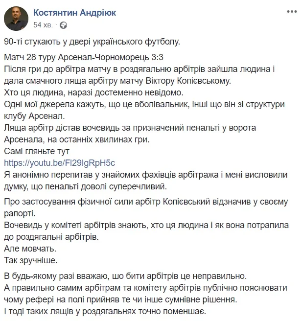 В любом случае считаю, шо бить арбитров – это неправильно. А правильно самым арбитрам и комитету арбитров публично объяснять почему рефери на поле принял то или иное сомнительное решение. И тогда таких "лещей" в раздевалках точно меньше", – написал Андриюк на своей странице в Фейсбуке.