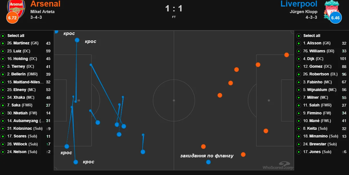 Да, у Ливерпуля не было Александера-Арнольда, а ван Дейк только недавно оправился от травмы, поэтому в перформансе Арсенала на левом фланге не было ничего удивительного – на один гол "канониры" могли рассчитывать. В целом же состав Ливерпуля был основным, а главные претензии возникали к атаке. Преимущество в интенсивности прессинга ничего не давало, потому что Арсенал грамотно выходил из-под него короткими розыгрышами и даже манипулировал давлением "красных". В позиционном же наступлении мерсисайдцы никак не могли раскрыть свободные зоны в обороне соперника, что вылилось в огромное количество поперечных передач. Ни один пас под удар не стал проникающим.