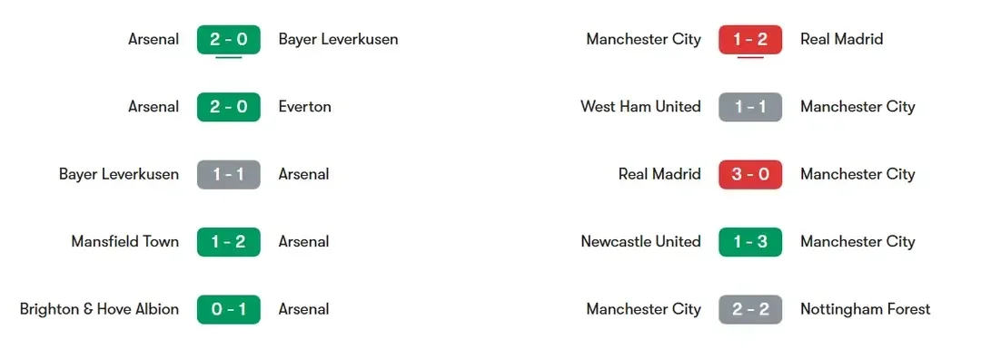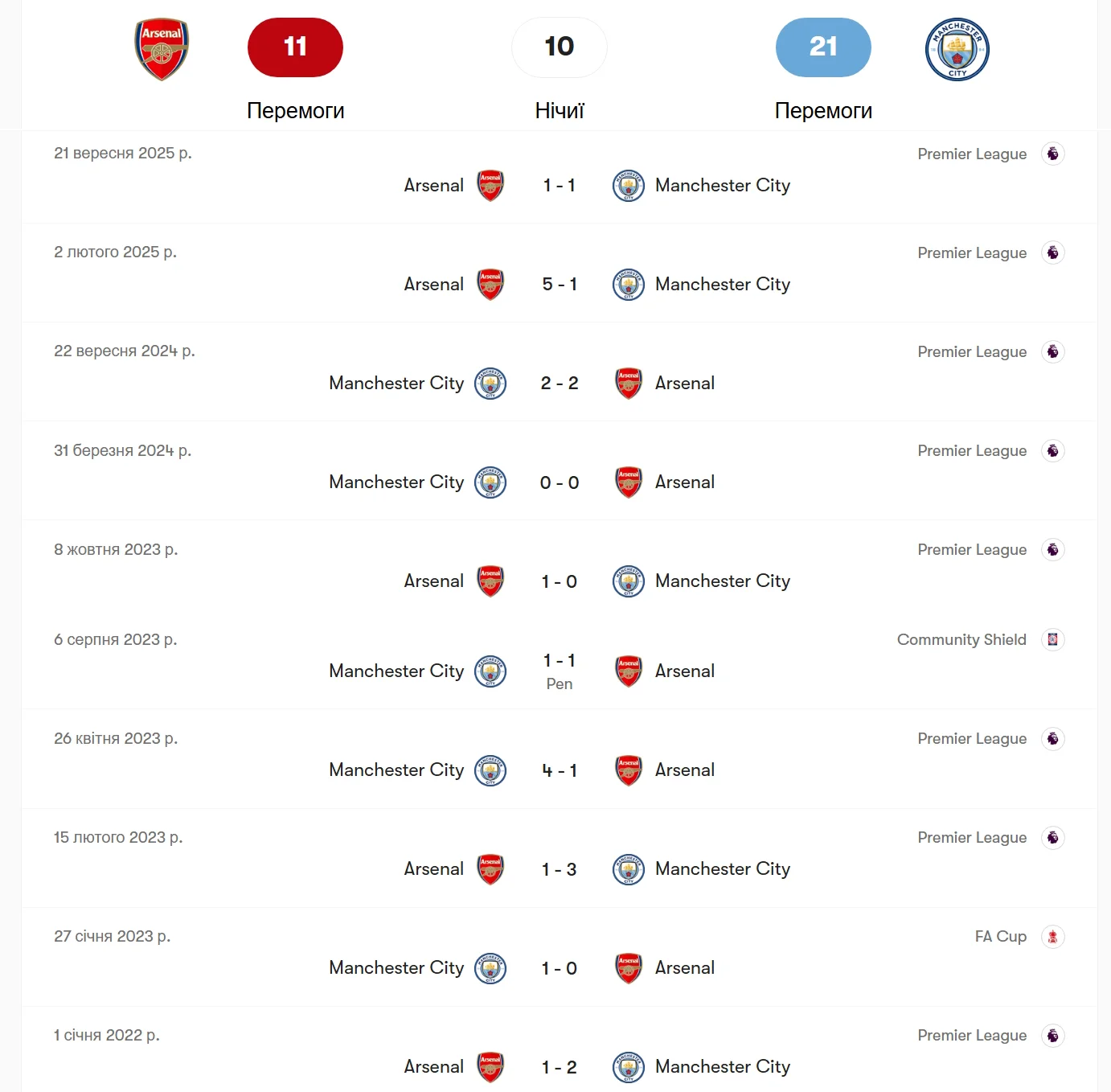 В последних очных встречах Арсенал несколько выровнял статистику, но она все еще в пользу "горожан", которые в предыдущих 10 матчах выиграли 4 раза, трижды были зафиксированы ничейные результаты и еще в 3 поединках (1 раз в серии пенальти) сильнее были подопечные Артеты.