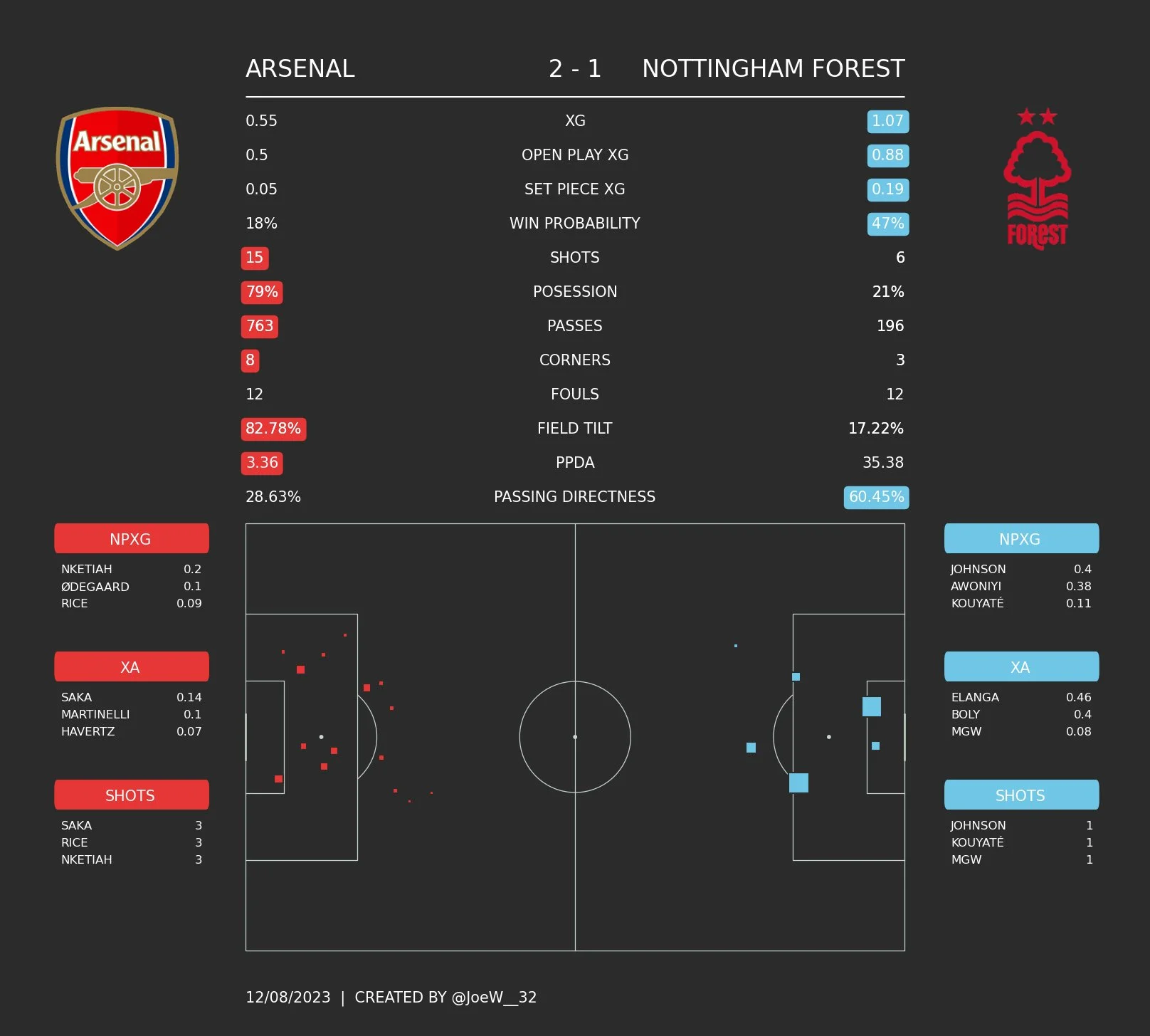 Мартинелли и Сака создали 2 на удивление эффектных гола, после попадания Букайо другой дебютант Хаверц аж за голову схватился. Лидеры атаки не первый сезон тащат Арсенал в сложных обстоятельствах. Самое смешное, что Ноттингем за свой 1 удар набил даже больший xG (0,43), чем Арсенал за 7 (0,31). По состоянию на 45 минут количество касаний в чужой штрафной поражает (18:3). Какой же невероятный левый фланг атаки у Арсенала. Мартинелли выдает 100-процентную точность пасов в финальной трети, создает больше всего моментов и выигрывает больше всего борьбы. А в запасе еще Троссар, один из лучших в межсезонье.