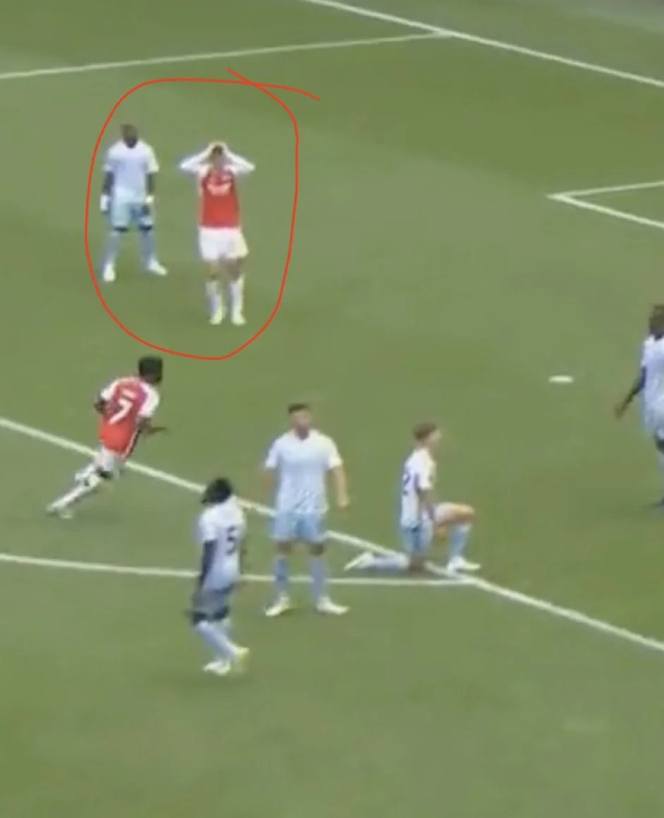 Гиббз-Уайт на левом фланге уничтожил финтом и на скорости Партея, но Джонсону не позволили развить атаку. Подстраховка работает. По сути Арсенал с мячом играет в 3 защитника (Тимбер слева, Салиба в центре, Уайт справа). Партей смещается в серединку, но формально должен в случае редких угроз от гостей закрывать зону на правом фланге. Тимбер грубо въехал в ногу соперника. Получил желтую новичок Арсенала и еще и травмировался. Боль была такая, что не мог ступить на газон, а на тренерской скамейке начали готовить замену. Нидерландский защитник в игру вернулся и даже успел обыграться с соперником перед свистком на перерыв.
