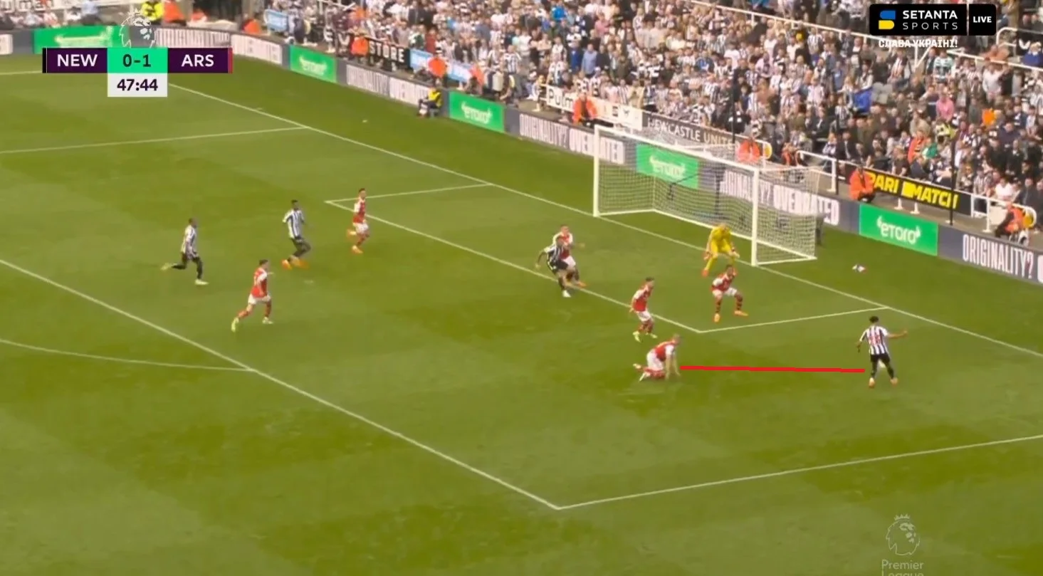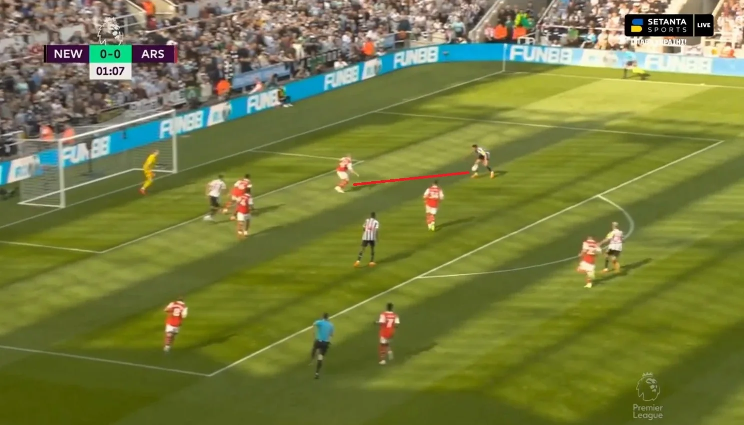 Дальше пошла яркая игра на встречных курсах. Обе команды смело прессинговали, не боясь ошибиться. Это открывало много пространства за спинами защитников. В таком режиме разгулялся Эдегор, который и сам остро бил, и вывел один на один с голкипером Мартинелли. Потом и Сака вышел на свидание с Поупом. Вратарь Ньюкасла все эти дуэли выиграл.