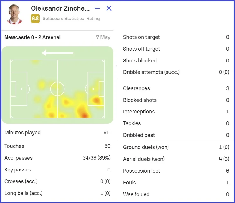 Зинченко получил средние оценки от статистических порталов: SofaScore – 6.8, WhoScored – 6.9, FotMob – 7.1. У него три удачных выноса головой и один перехват.