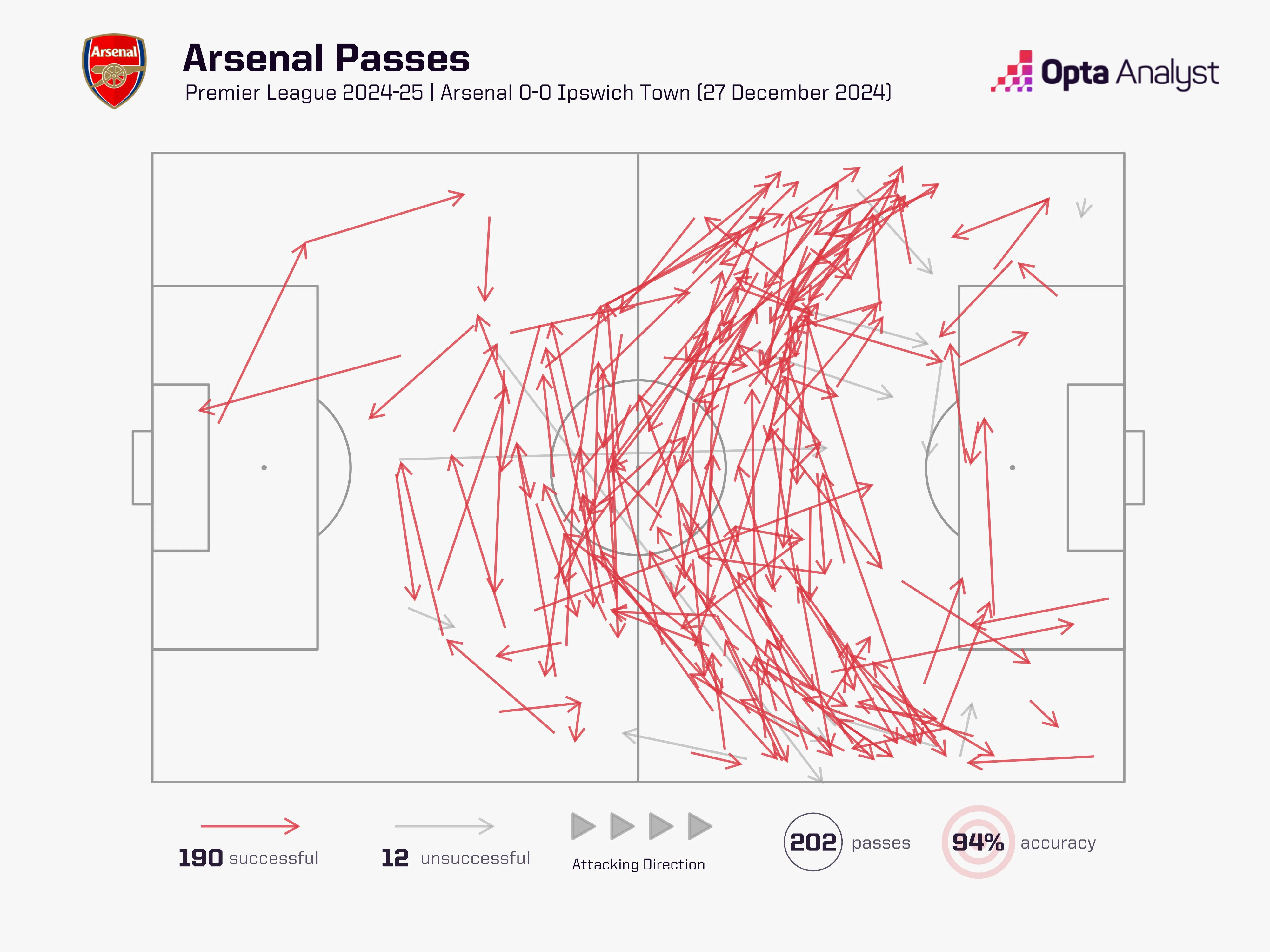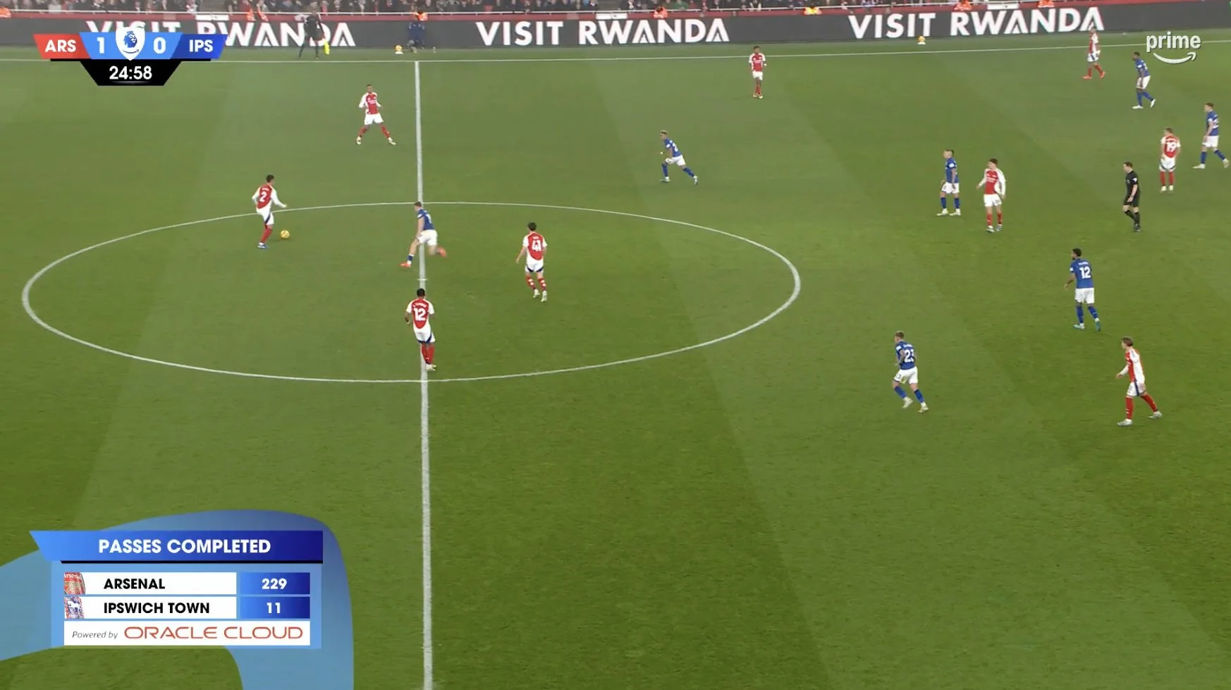 Доминирование "канониров" в первом тайме оказались тотальным. На некоторых отрезках игры владение лондонцев доходило до 91,4%. После 25-й минуты статистическая модель Oracle насчитала 229 передач Арсенала против 11-ти у Ипсвича. Opta за стартовые полчаса дала похожие цифры – 202 паса против 10-ти.