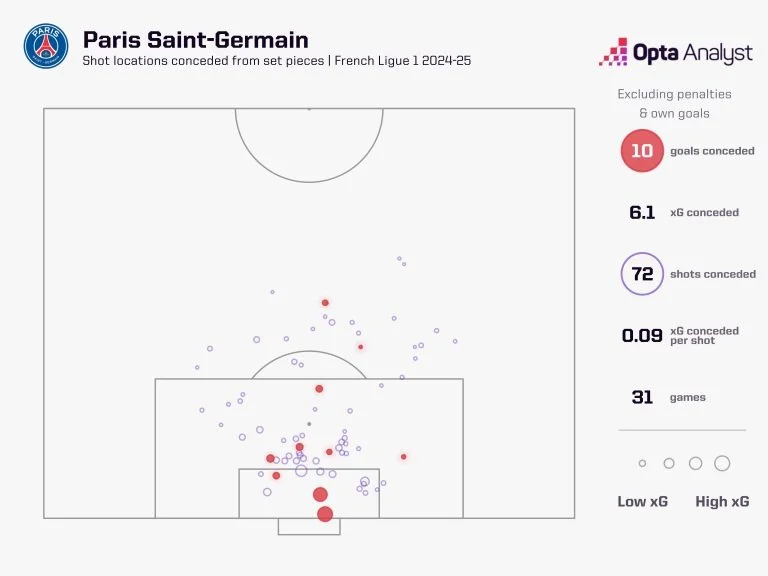 А еще у французского гранда есть уязвимость при обороне на стандартах, что в контексте противостояния с Арсеналом крайне неприятно. Только четыре команды Лиги 1 пропустили больше голов со стандартов (11), чем подопечные Луиса Энрике (10). С угловых, штрафных и аутов соперники ПСЖ наиграли на 6,2 ожидаемых гола– это 21% от общего количества ожидаемых пропущенных голов Парижа.
