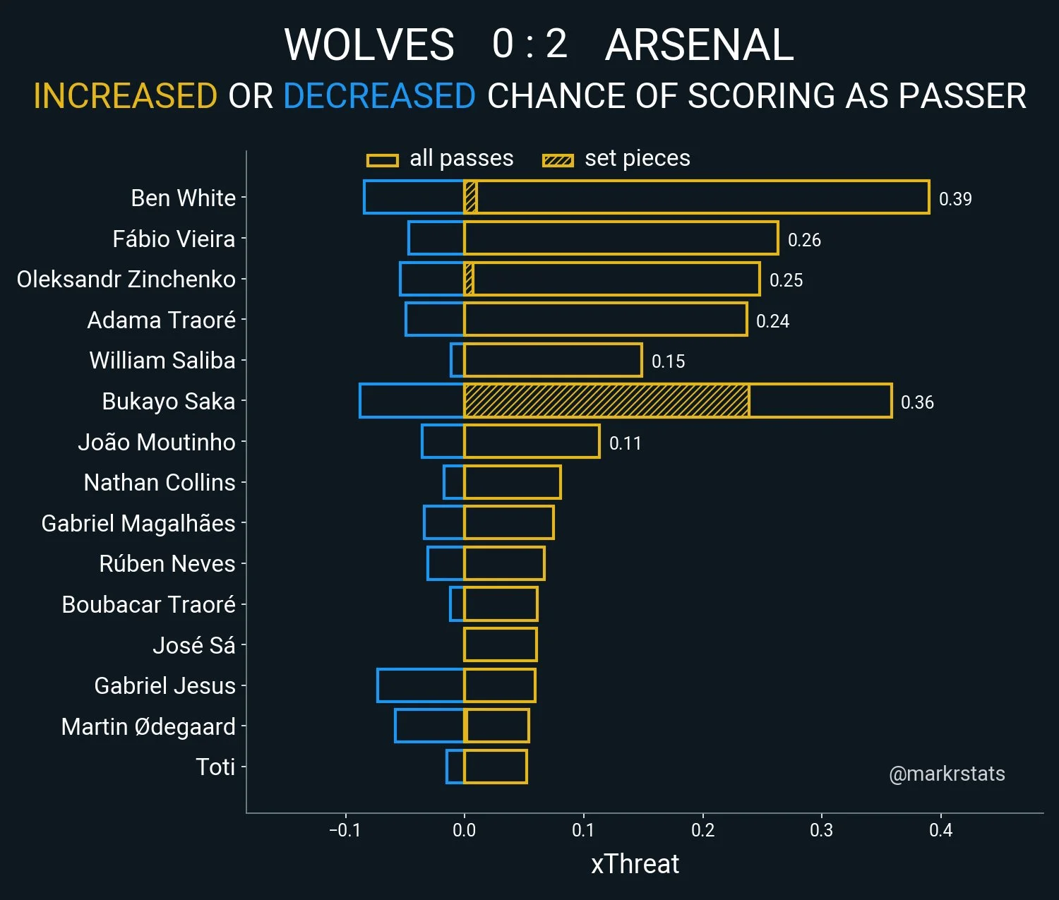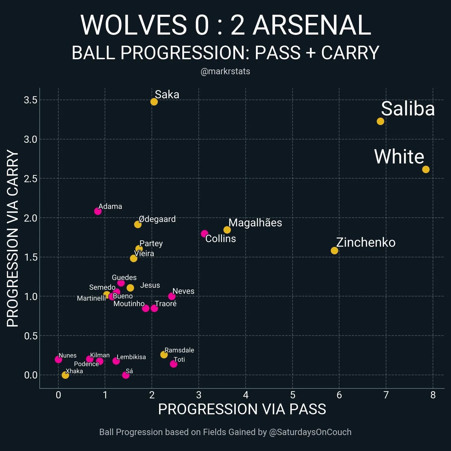 Все дороги ведут к Жезусу. Уайт мягко набросил в направлении дальней стойки, однако и 4 удар бразильца не нашел путь к воротам. Серию бразильца прервал выстрел Траоре. Адама в своем стиле пробивал очень мощно – это больше подошло бы регби. Арсенал будто сам делает все, чтобы Вулверхэмптон забил хотя бы раз. Салиба ужасно отдавал назад. Гедеш принял подарок, развил крейсерскую скорость, а вот с прицелом снова не сложилось. Лидеры АПЛ набили только 0,47 ожидаемого гола на 6 ударах. У "волков" 0,14 xG в 3 выстрелах. Арсенал был откровенно лучше по ударам из пределов штрафной (5:2), однако его оборона предоставляла соперникам значительно больше пространства.