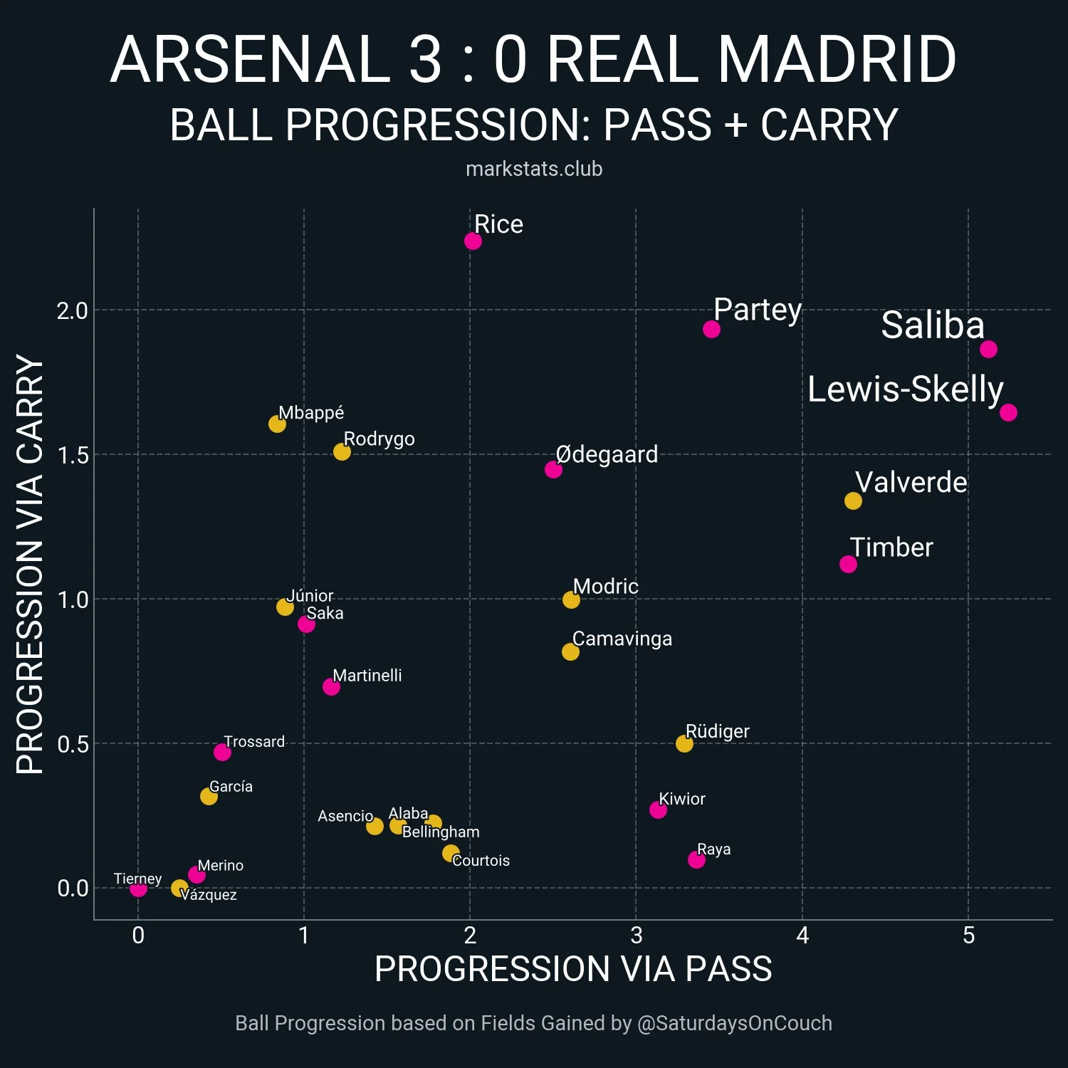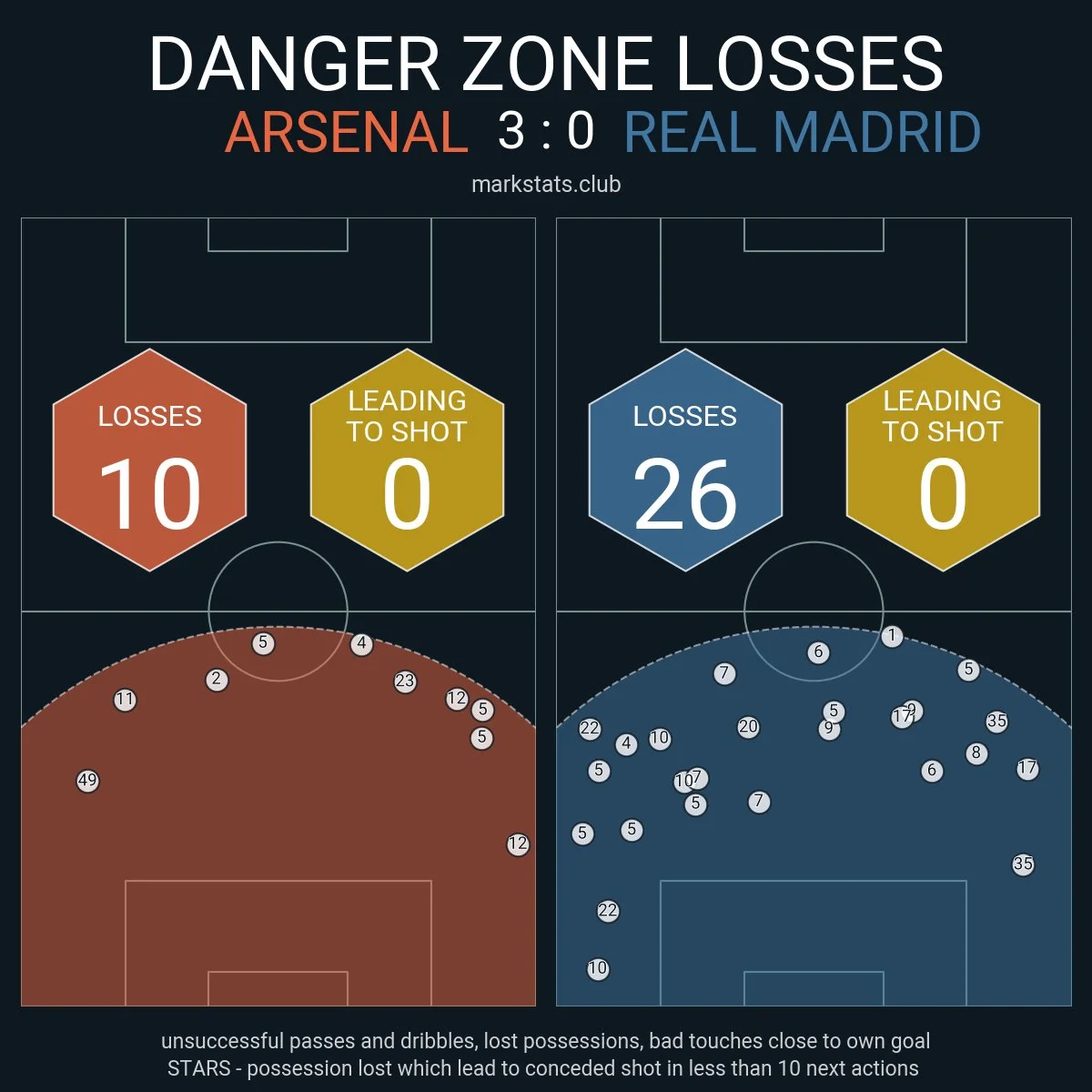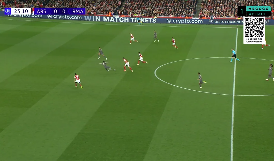Мерино постоянно держал на себе двух центрбеков, а пространство между линиями атаковали Райс, Льюис-Скелли и все тот же Эдегор. При этом Арсенал не боялся оказывать агрессивный прессинг, хотя это было очень опасно – Реал является лучшим в мире в переходных фазах. Эффективность давления "канониров" ярко демонстрирует карта низких потерь, которых у Мадрида насобиралось целых 26.