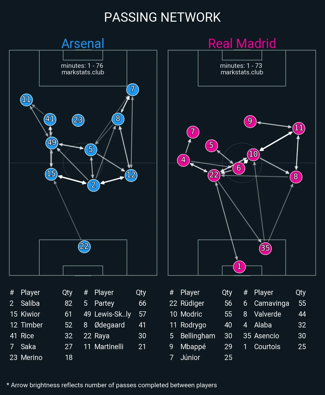 Тактические аналитики предостерегали Реал от игры в высокий прессинг. "Королевский клуб" даже в Ла Лиге хуже 82% команд Ла Лиги в этом аспекте, в то время как "канониры" превосходят 95% представителей АПЛ по устойчивости к давлению в первой фазе атак.