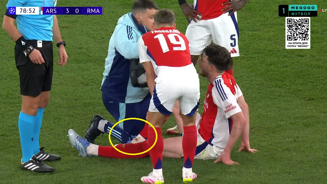Сака же перед вторым штрафным Райса получил удар в голеностоп и сразу же начал хромать. На 72-й минуте Букайо вообще лег на газон, после чего его заменили. Спортивный врач и автор телеграм-канала Hospital Pass – Дмитрий Бабелюк – подозревает травму Букайо.