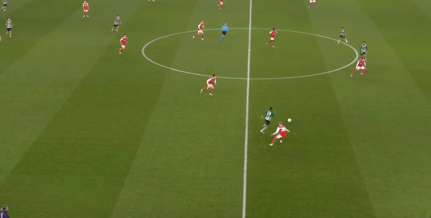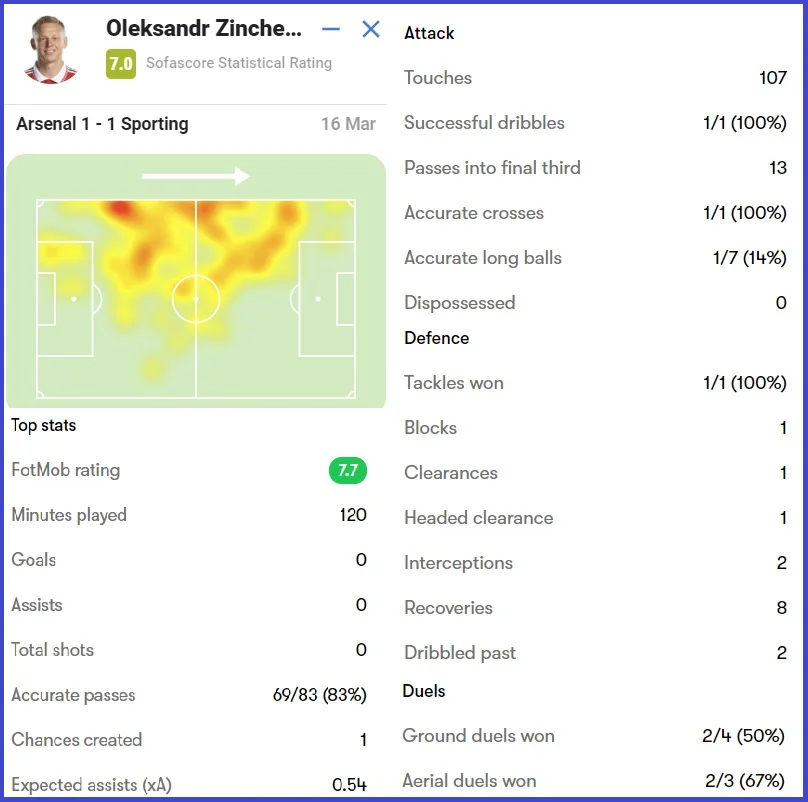 В обороне снова было сложно. Спортинг не делал столь явный упор на его зону, как в первом матче, но все же попытался организовать несколько атак. Прессинг Арсенала не всегда был совершенным, потому за спиной Александра возникали свободные зоны. Украинец сорвал две вражеские атаки, сыграв на перехватах.