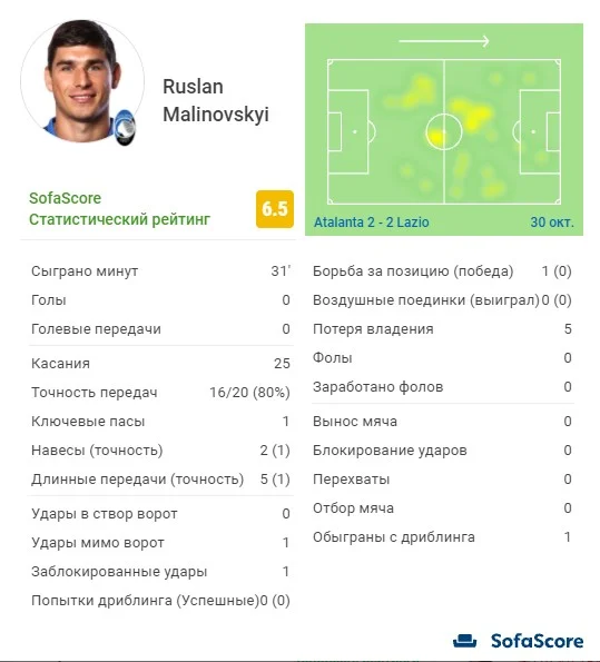 Малиновский и не провалился, и не поразил. В частности, ему не удалось использовать свой главный "скилл" – удар. Более того, на последних минутах матча, при счете 1:2, Руслан промахнулся с убийственной позиции, и вполне мог превратиться в антигероя. К счастью, уже перед финальным свистком он сделал тот же спасительный навес. Однако это вовсе не аргумент для популярных аналитических порталов. SofaScore с WhoScored оценили Малиновского второй самой низкой оценкой – 6.2 и 6.5 баллов соответственно.