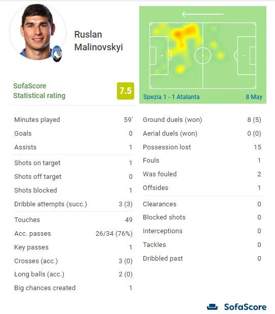 Гости все-таки завершили победное дело. На последних минутах Муриель протянул, Пашалич классно открылся и идеально вырезал в бильярдном стиле от штанги. Добротный выход Коваленко. Неплохо отборолся, подчищал и заблокировал удар, начал потенциально голевую атаку. Однако этого мало против такого соперника. Третья победа за 10 туров. Команда Малиновского на финише сезона обыгрывает только в гостях и исключительно соперников из низов турнирной таблицы. Аталанта набрала 59 очков и сравнялась с занимающей 6 место Ромой. У Специи осталось 33 балла, и борьба за выживание еще продолжается.