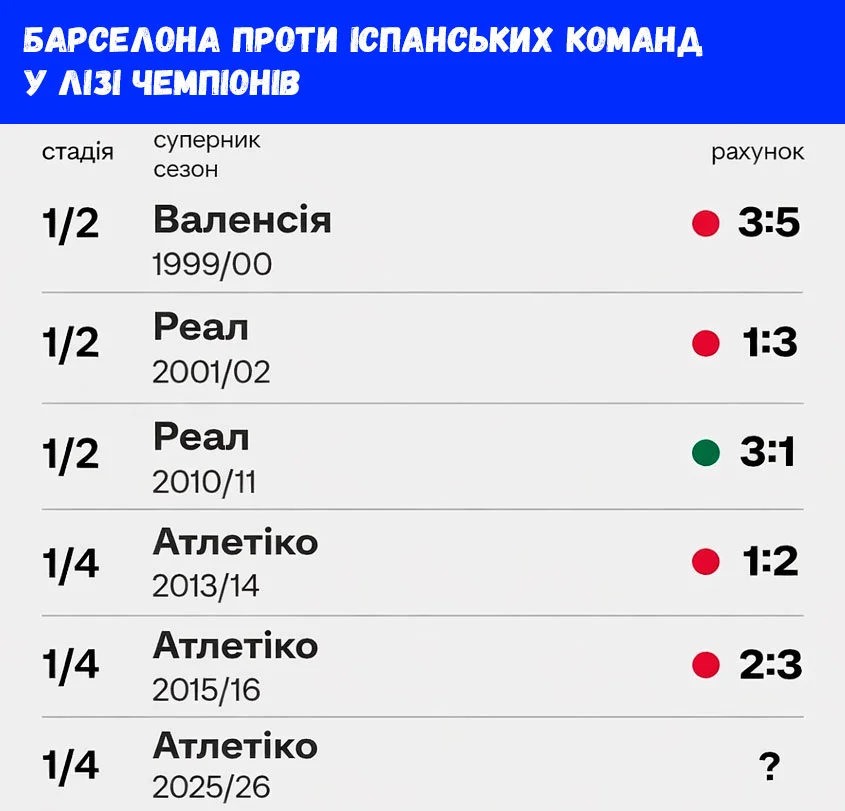 Существует еще два кейса, которые ставят прорыв Барселоны под сомнение. Во-первых, "блаугранас" никогда не проходили Атлетико в ЛЧ – каталонцы вылетали в четвертьфиналах в сезонах 2013/14 и 2015/16. Кроме того, каталонцы вылетали от Валенсии и Реала в полуфиналах, а пройти испанскую команду в данном турнире удалось только раз – "жертвой" стал все тот же Реал в полуфинале 2010/11.