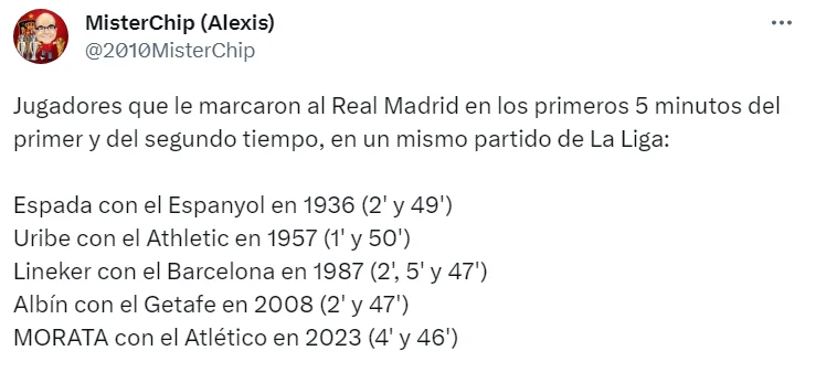Таким образом, "королевский клуб" пропустил три гола головой впервые за пять лет (последний раз это случилось во встрече с Жироной), а Атлетико забил головой трижды впервые с 2015-го. Мората же вступил в элитный клуб – только пять футболистов смогли забить Реалу в Ла Лиге в стартовые 5 минут каждого из таймов.