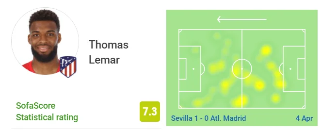 Ни один игрок "матрасников" не принёс столько пользы, сколько принёс Лемар. Правда, по показателю вовлеченности к атакам у Тома стоят нули, однако Атлетико до 77-й минуты в принципе ничего не создавал. Это не может служить оправданием – атакующий хавбек в таком матче должен делать намного больше. Впрочем, партнёры не могут похвастаться и таким уровнем.