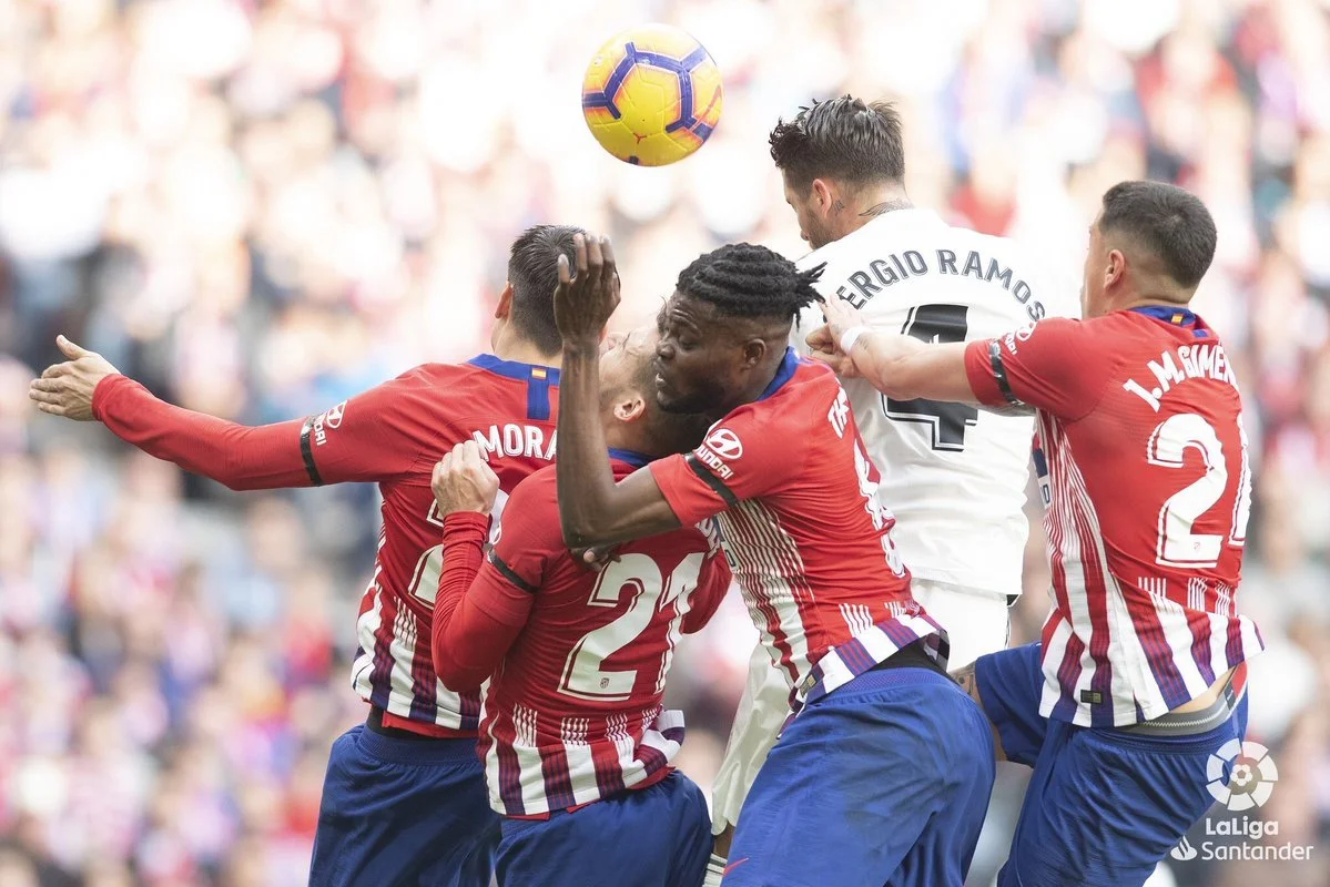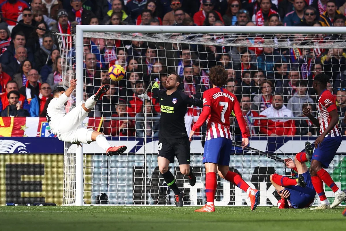 На момент Партея, который сам пролез в штрафную Реала, ответил Модрич. Лука замыкал навес головой – оба неожиданных хода не принесли успеха и хотя бы первого точного удара. А вот дебютным точным ударом команда Солари открыла счет. После подачи углового, которую арбитр заставил повторить, Рамос выиграл верховую борьбу у 4-х (ЧЕТЫРЕХ) соперников, а Каземиро забивал ударом через себя без всякой опеки – эта сцена вполне могла бы стать иллюстрацией к легендарной книге "100 лет одиночества". Первый гол ударом бисиклетой, который пропустил Атлетико в чемпионате Испании за время правления Симеоне!