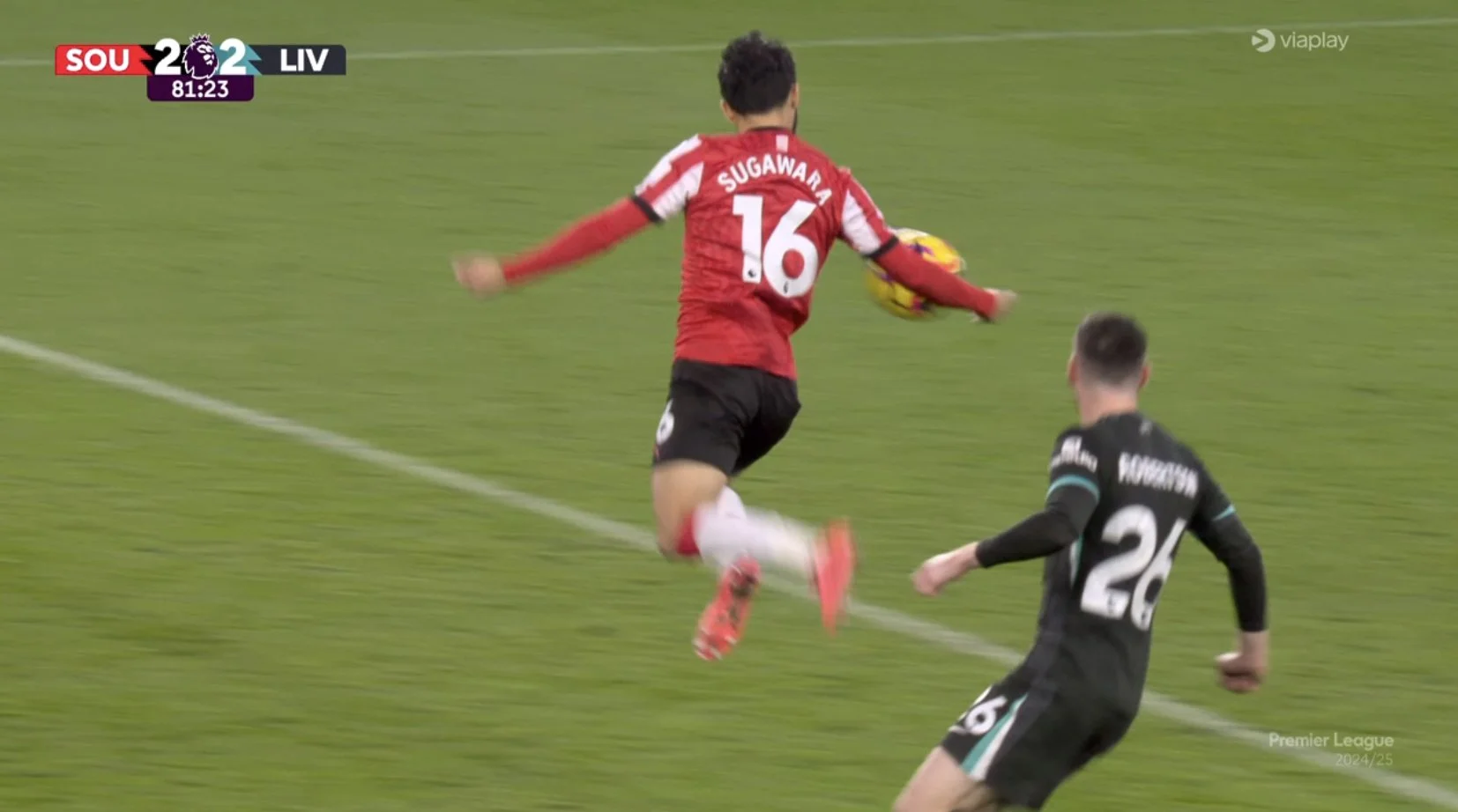 Салах устал без мяча и из глубины забросил на Дарвина, тот катит на пустые ворота, но Диас не может замкнуть дальнюю стойку, потому что слишком быстро добегает до нее. И тут Гравенберх забрасывает длинный пас, а Маккарти, вылетая из ворот, просто дарит Салаху халявный гол – Мохамеду пришлось лишь выставить ногу, это даже ударом не назовешь. Сугавара решил, что как-то тяжело Ливерпулю идет процесс с победным голом и решил какого-то милого вытянутой рукой укрощать отскочивший от груди мяч. Слишком очевидное действие, поэтому это пенальти. Салах оформляет дубль, снимает футболку и светит голым торсом.