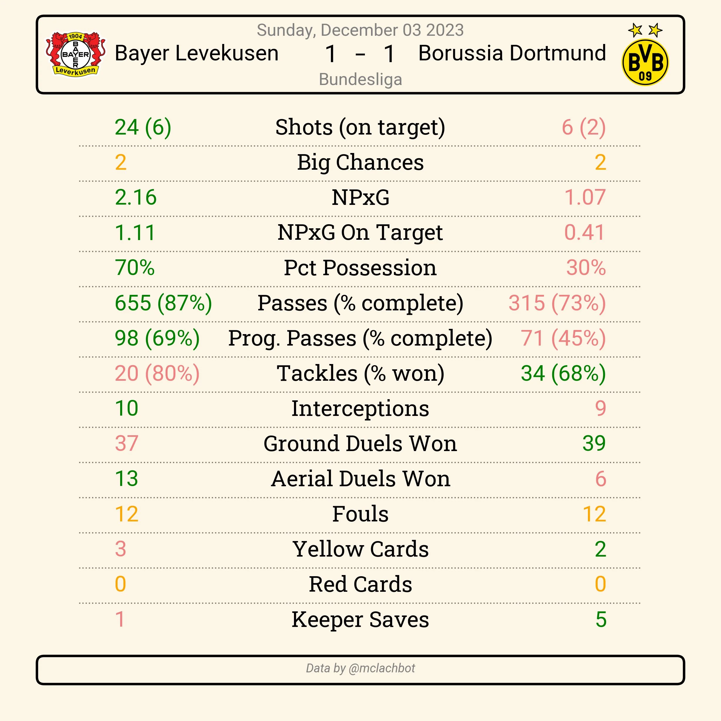 Атаки были хорошими. Не хватало более эффективного насыщения зон завершения. Дортмундцы все же лучше ориентировались в собственной штрафной, используя численное большинство. Байеру приходилось делать больший акцент на дальние удары, которые не всегда летели в цель.