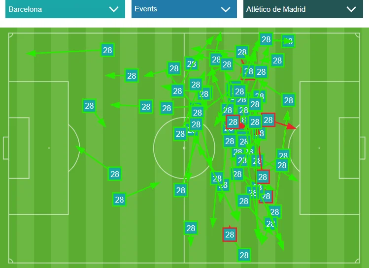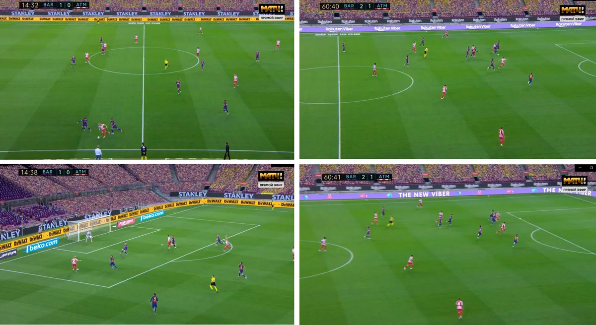 Позиционные атаки Барселоны развивались страшно медленно. Даже обыгрыш одного двух-игроков и продвижение сквозь линии метров на 20 не давало "блаугранас" никакого преимущества – Атлетико успевал всё перекрывать. Показательна статистика проникающих передач подопечных Сетьена – их было всего четыре. И это при 72% владения мячом, двукратном преимуществе в интенсивности прессинга и 21 успешной обводке.