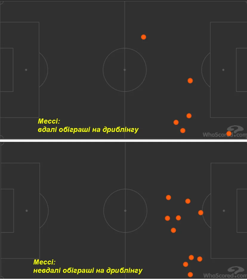 Не пошло у Месси и с обыгрышам. Ну, как не пошло: когда футболист 7 раз проходит соперника на дриблинге – это уже гениально, но у Лео было 17 попыток. Впрочем, даже до этого не так много претензий, как к зонам, в которых происходили эти обыгрыши – аргентинца явно выталкивали во фланг, а вот в ключевых зонах ему прохода не давали.