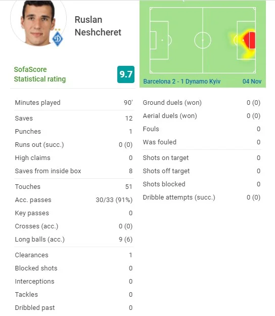 Ну, а Нещерет, который своими 12 сейвами (целых 8 после расстрельных ударов из пределов штрафной) затмил даже шоу Тер Штегена в рамке? В 18 лет только в субботу дебютировать в УПЛ, пропустить с первого же удара гол-красавец, собраться и стать лучшим вратарем этой Лиги чемпионов по количеству спасений в матче (от 9 до почти 10 баллов по версии всех статистических порталов). Роскошный, знаете, еврокубковый дебют!