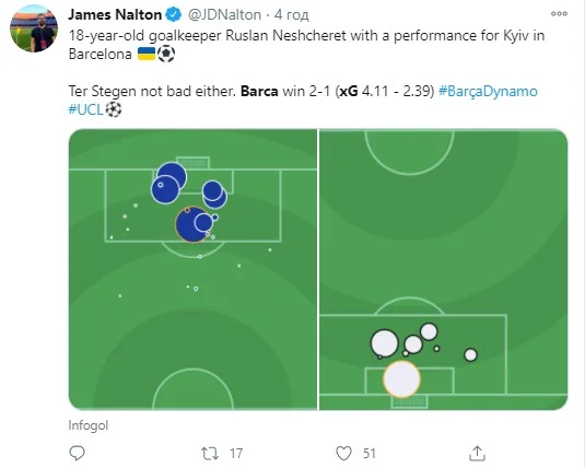 Да, и допустили заоблачное количество моментов (на 4,11 xG), но это было неизбежно с планом высидеть глубоко, только немножечко приотрывая двери автобуса, чтобы проветрить. Более половины остроты каталонцев пришло в первые 15 минут. В остальные 75 Динамо создавало даже чуть больше качественных голевых моментов. Ненамного, но больше, и это феноменально. Барселона забила с пенальти, а потом долго не могла закрыть игру. Когда казалось, сделала это, соперник воскрес и мог даже сравнивать.