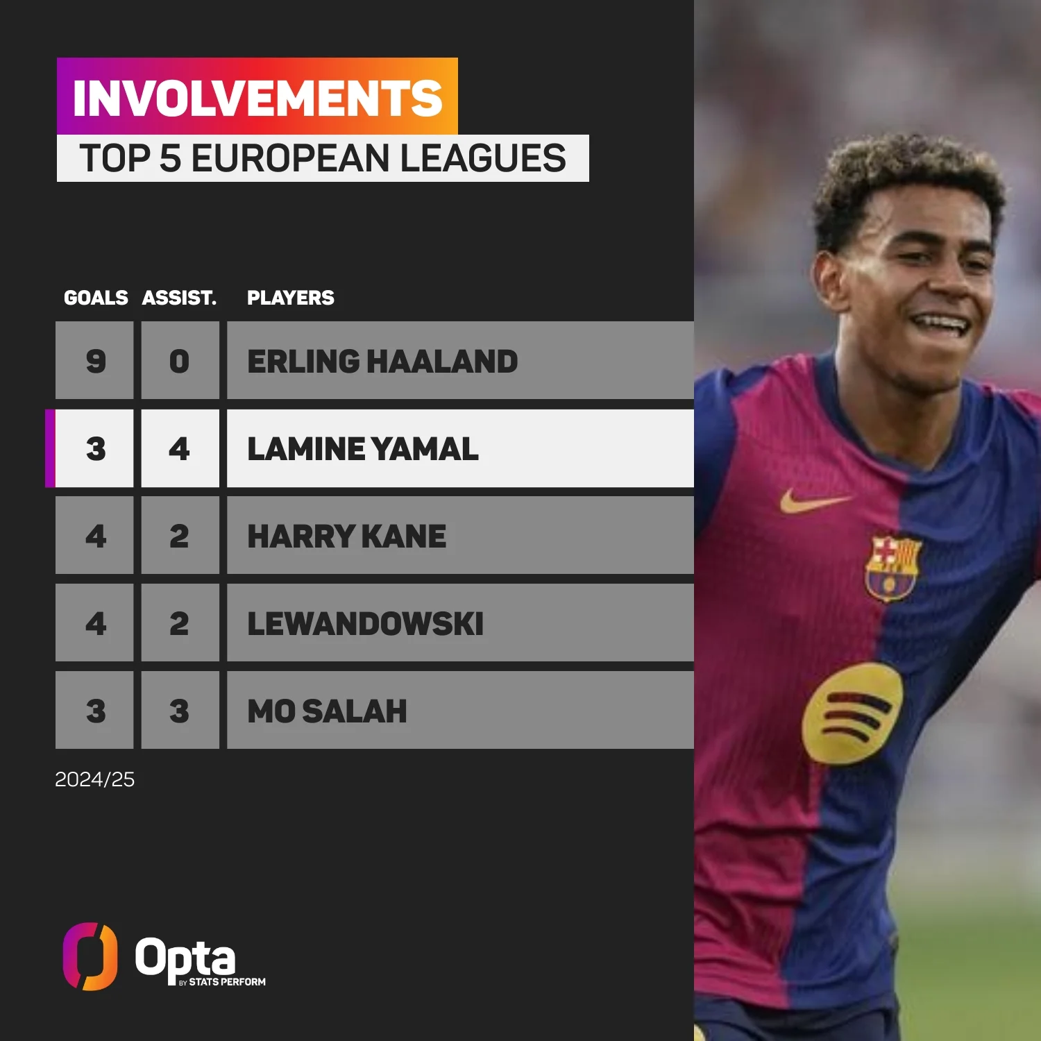 В нынешнем сезоне у 17-летнего испанца уже 7 результативных действий (3 гола и 4 результативные передачи). Только один игрок в топ-5 чемпионатах имеет лучшие показатели. Конечно, это Эрлинг Холанд.
