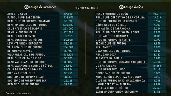 Общая сумма "блаугранас" составляет 632,971 евро, что является наибольшим показателем в Ла Лиге. Реал второй с суммой 566,530 млн евро. Замыкает тройку мадридский Атлетико – 293 млн евро.