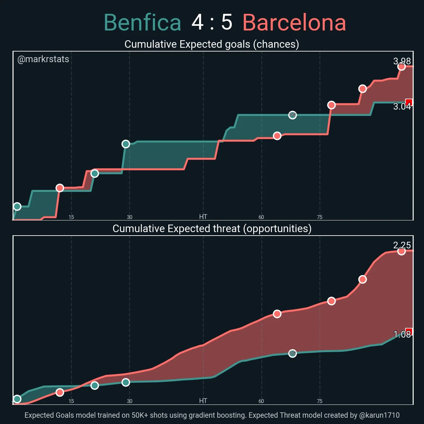 Показатели ожидаемых голов (сверху) и ожидаемой остроты (снизу)