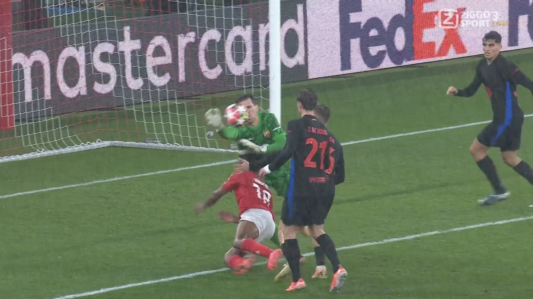 В финале Суперкубка он оставил Барсу в меньшинстве, сыграв на выходе, а с Бенфикой голкипер устроил перфоманс. На 22-й минуте Войчек побежал за пределы штрафной на перехват заброса... и сбил Бальде! Алекс, между прочим, был первым на мяче, а вследствие столкновения сфера досталась португальцам.