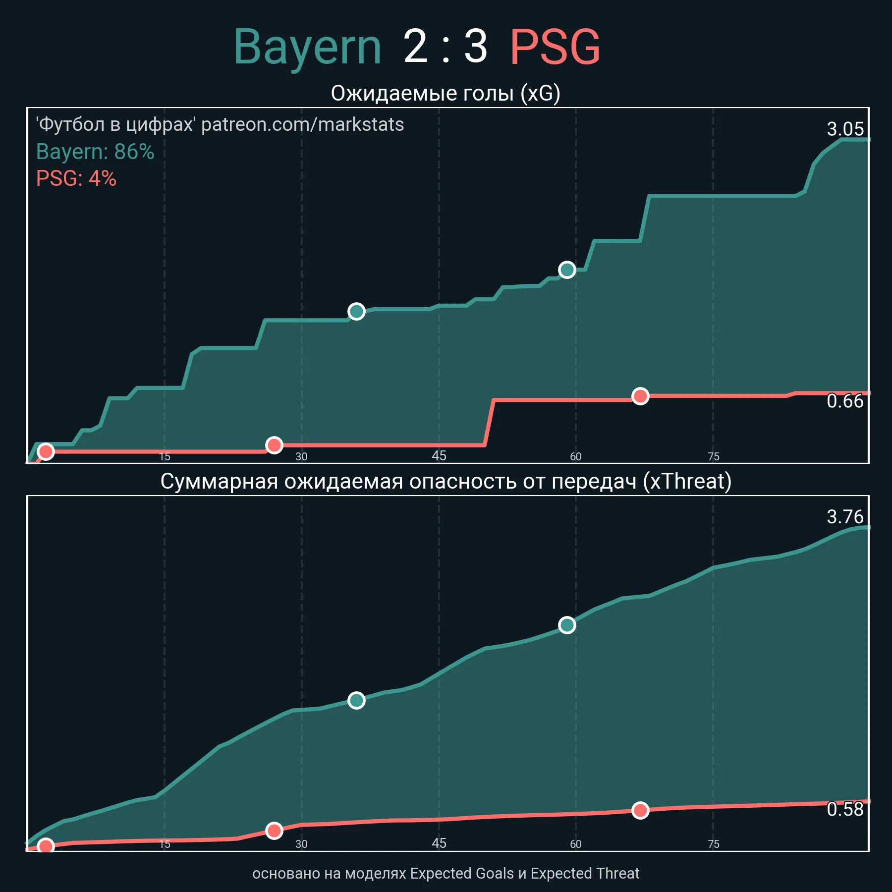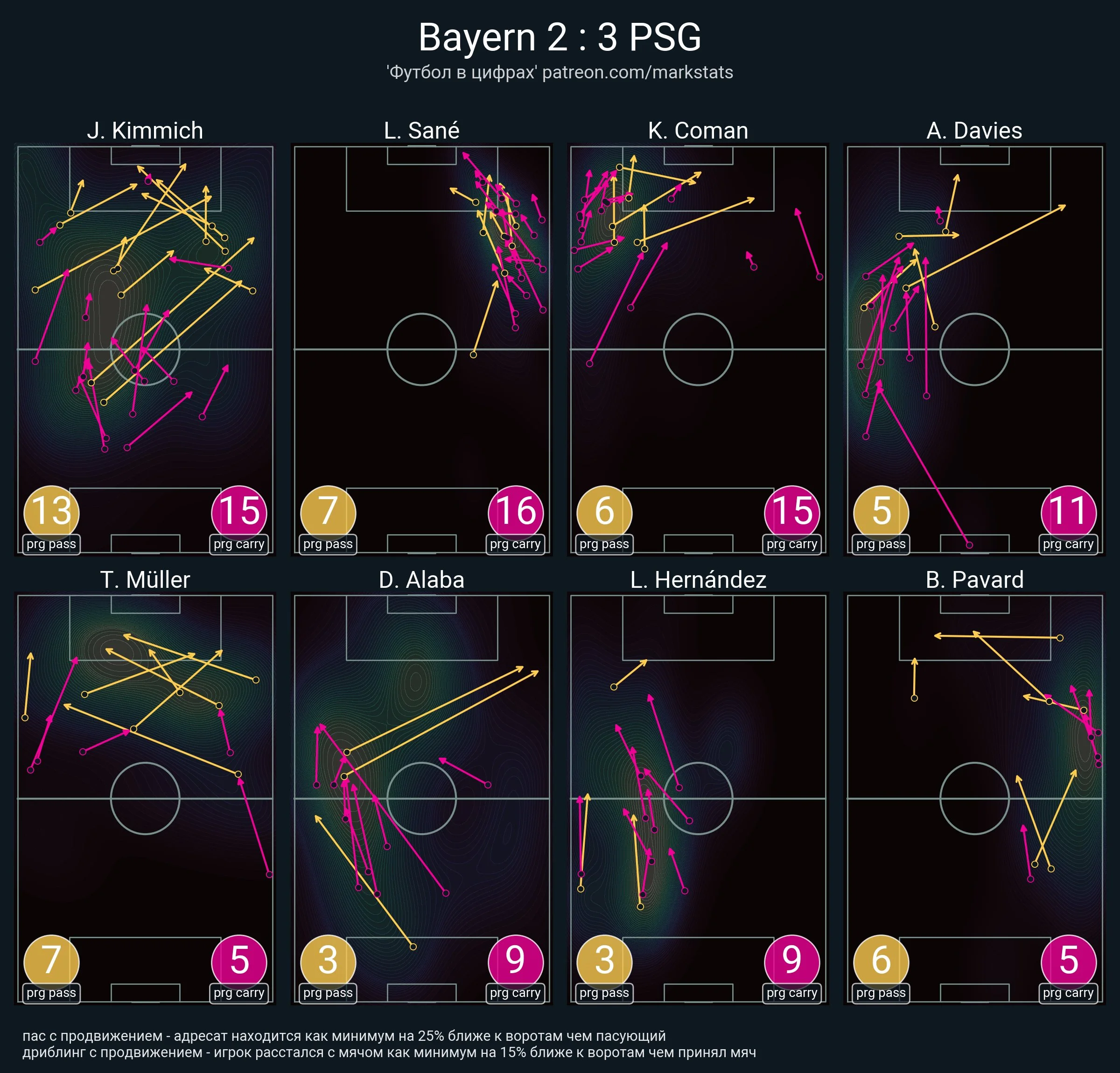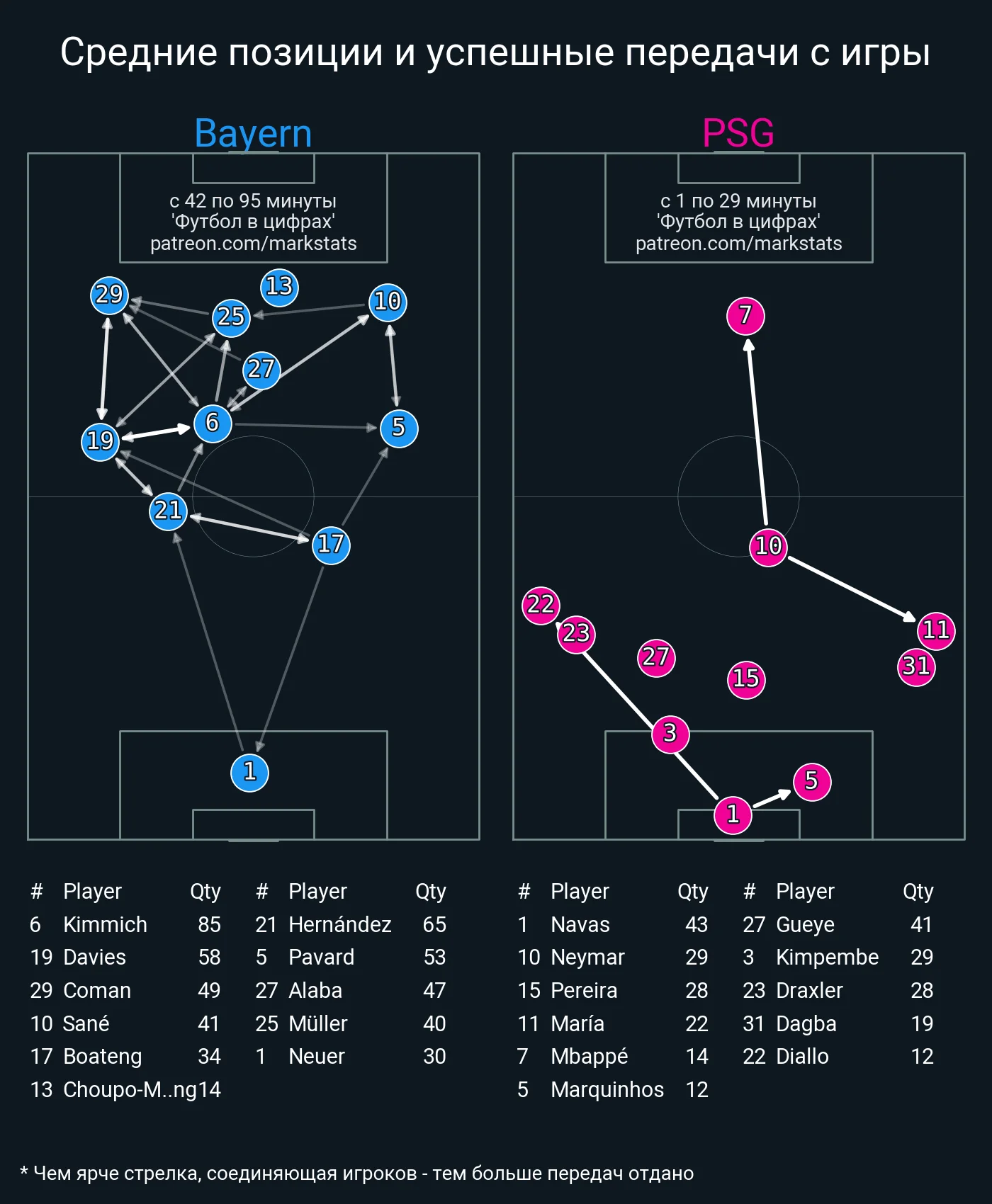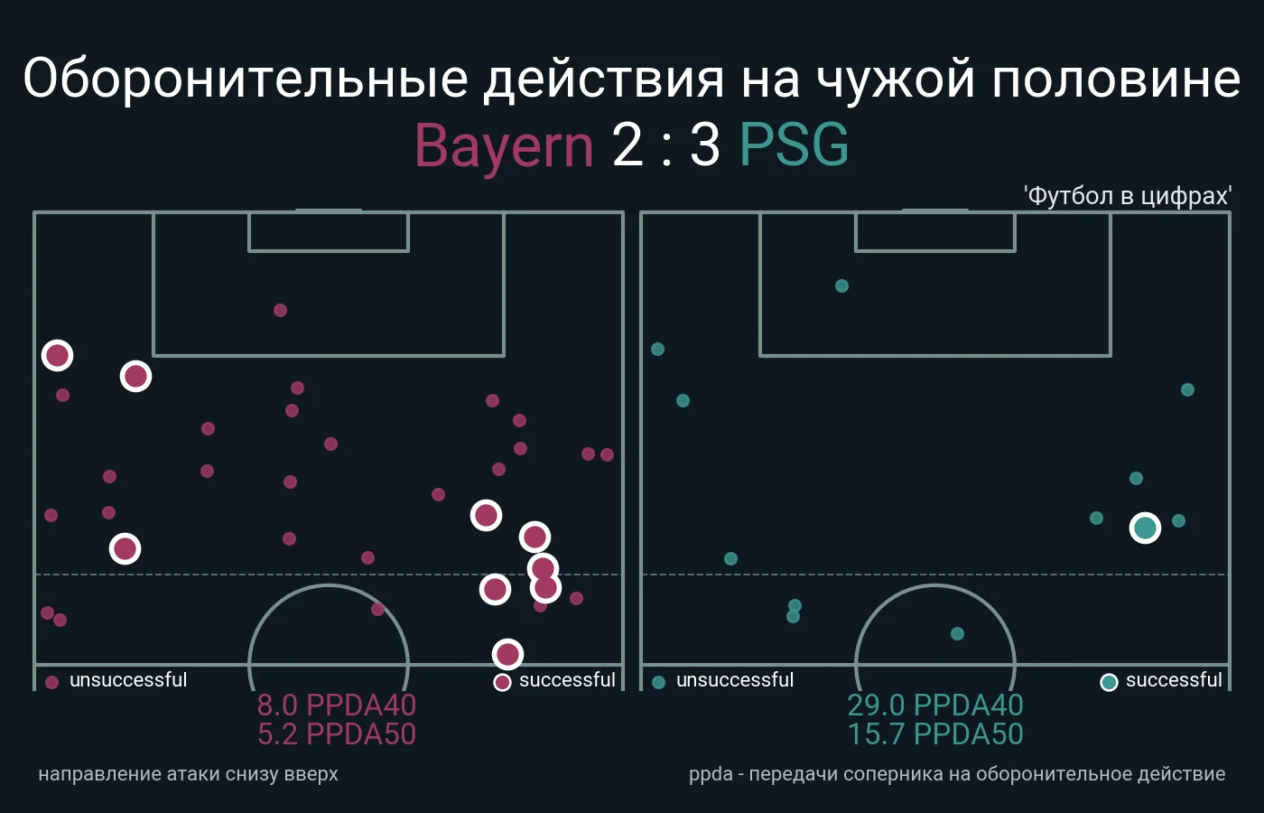 Благодаря пассивности нападающих ПСЖ мюнхенцы провели просто фантастические показатели интенсивности прессинга. На дистанции 40 метров от ворот они не позволяли парижанам провести более 10 передач, а на дистанции в 50 метров каждая пятая передача гостей завершалась потерей мяча.