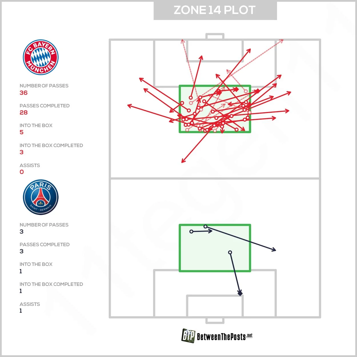 Еще ярче есть карта передач с одной только "зоны 14" (центральной перед штрафной). Бавария отсюда провела 36 передач (28 точных), из которых 5 прошло в штрафную (3 точных). У ПСЖ за весь поединок было только три паса отсюда.