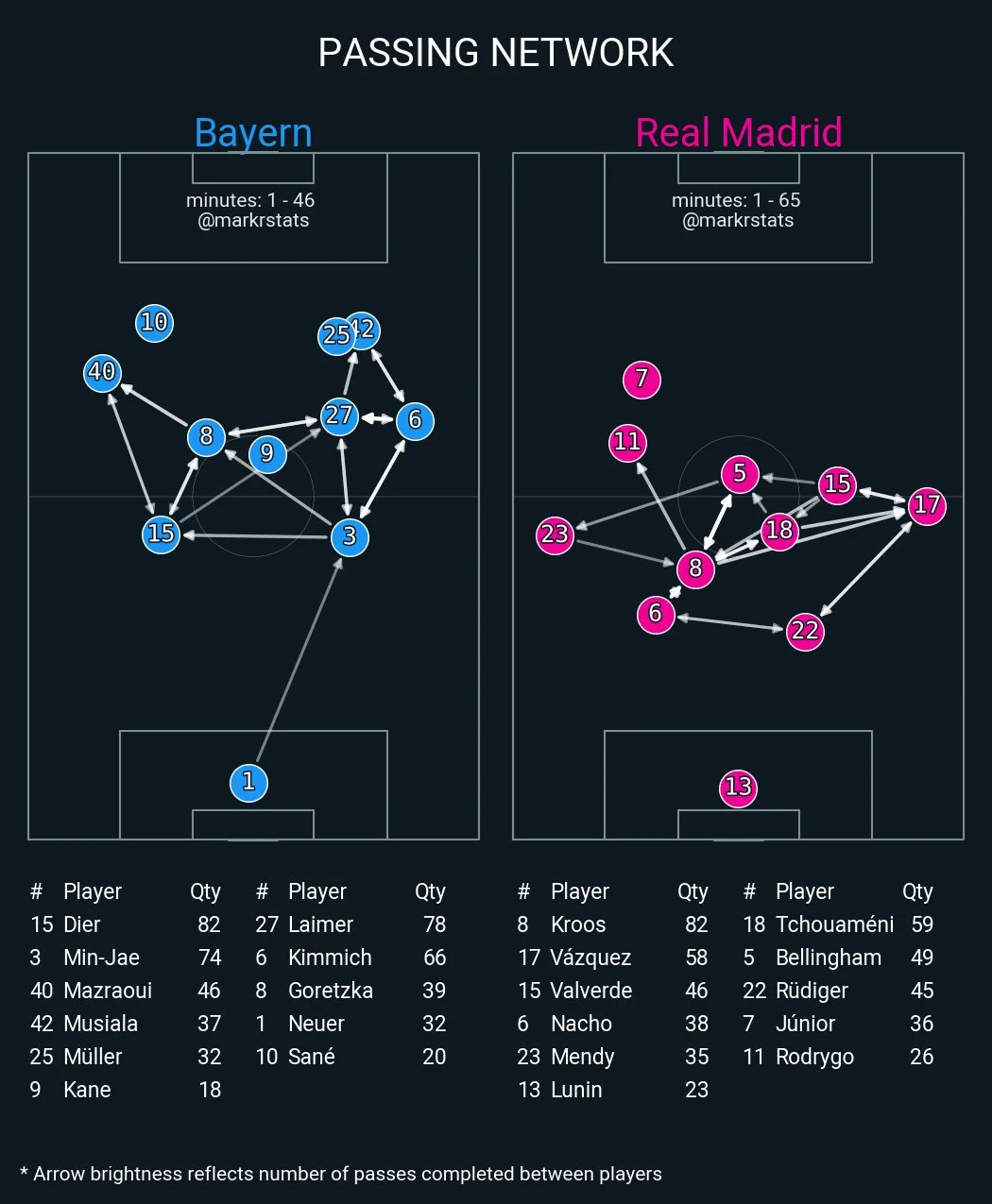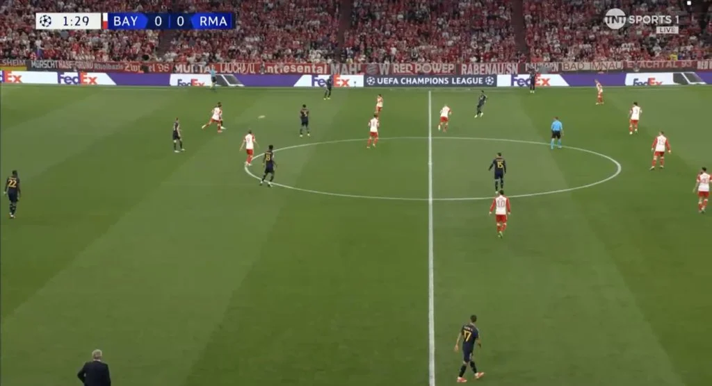 Во-вторых, мюнхенцы уделили мало внимания Кроосу. В-третьих, частично сработала идея Карло Анчелотти из матча против Сити, когда Родриго начинал слева, а Винисиус располагался на позиции левого форварда.