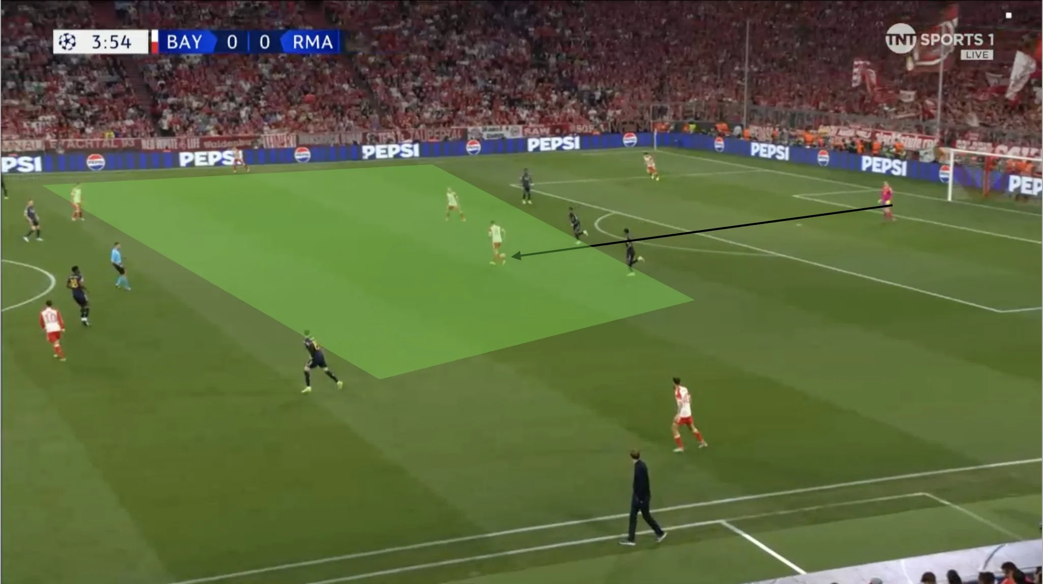 Легендарный раумдойтер формально расположился рядом Кейном в схеме 4-2-2-2, однако на практике Харри опускался очень низко – даже ниже опорников. Мусиала расположился справа, а Сане перевели на левый фланг.
