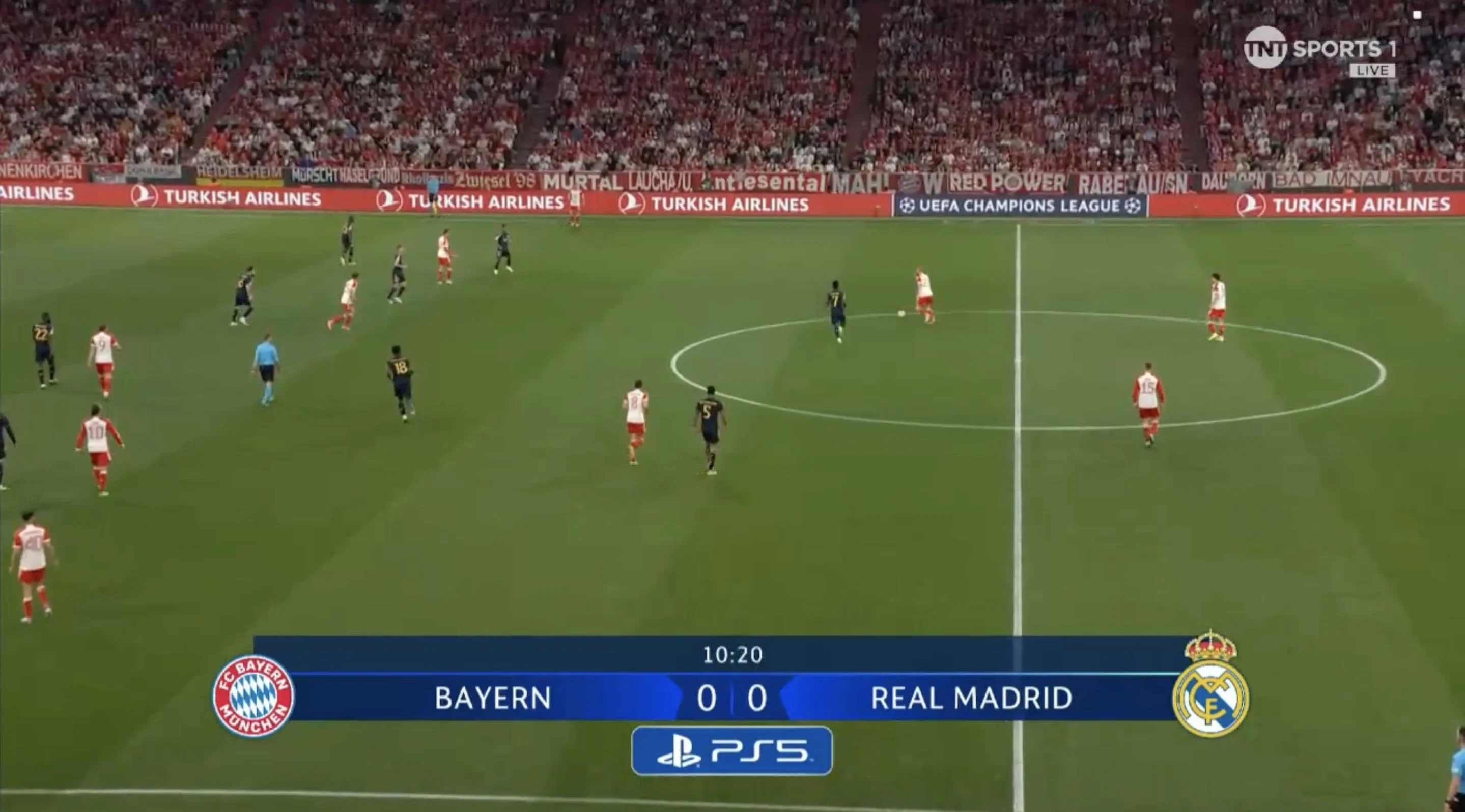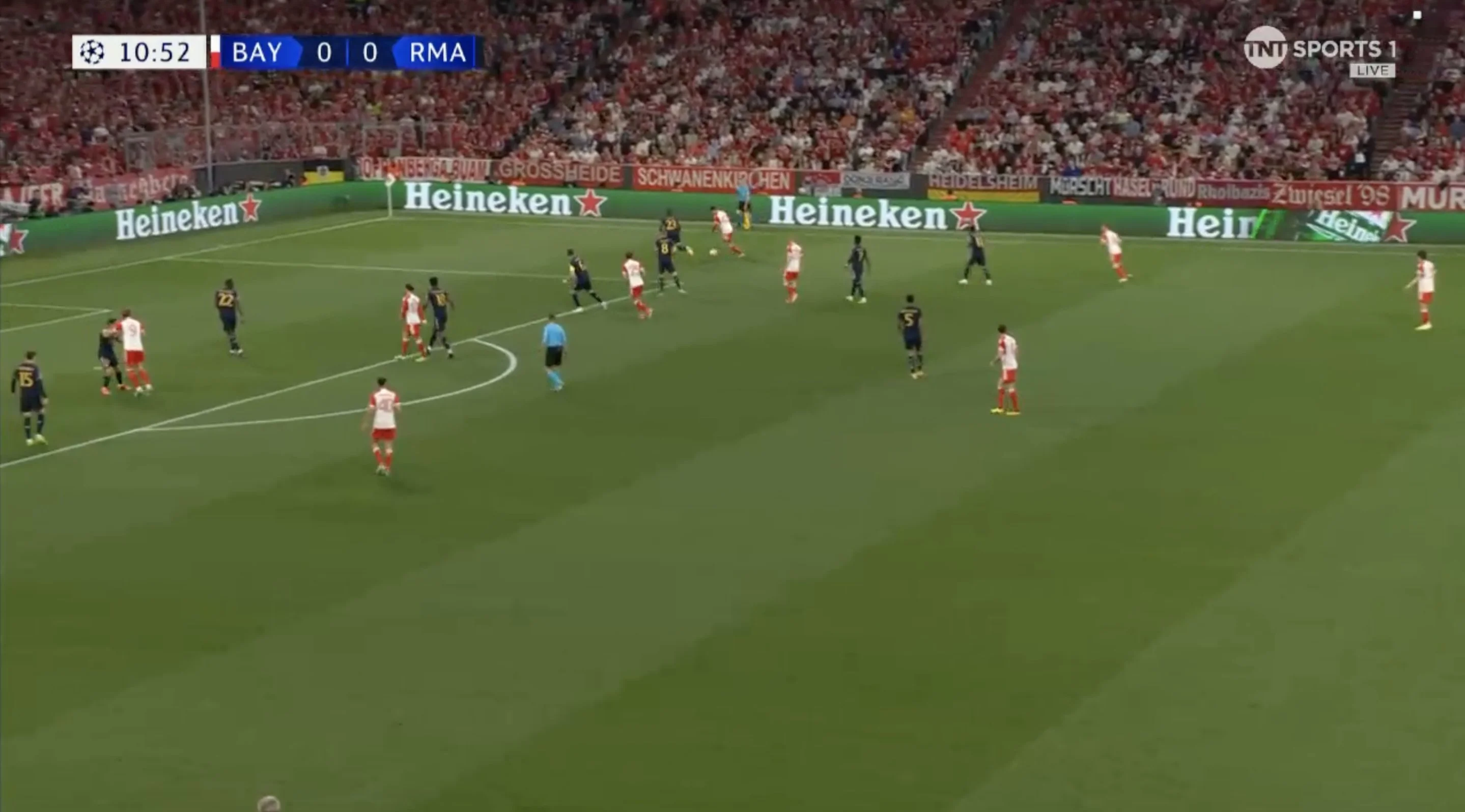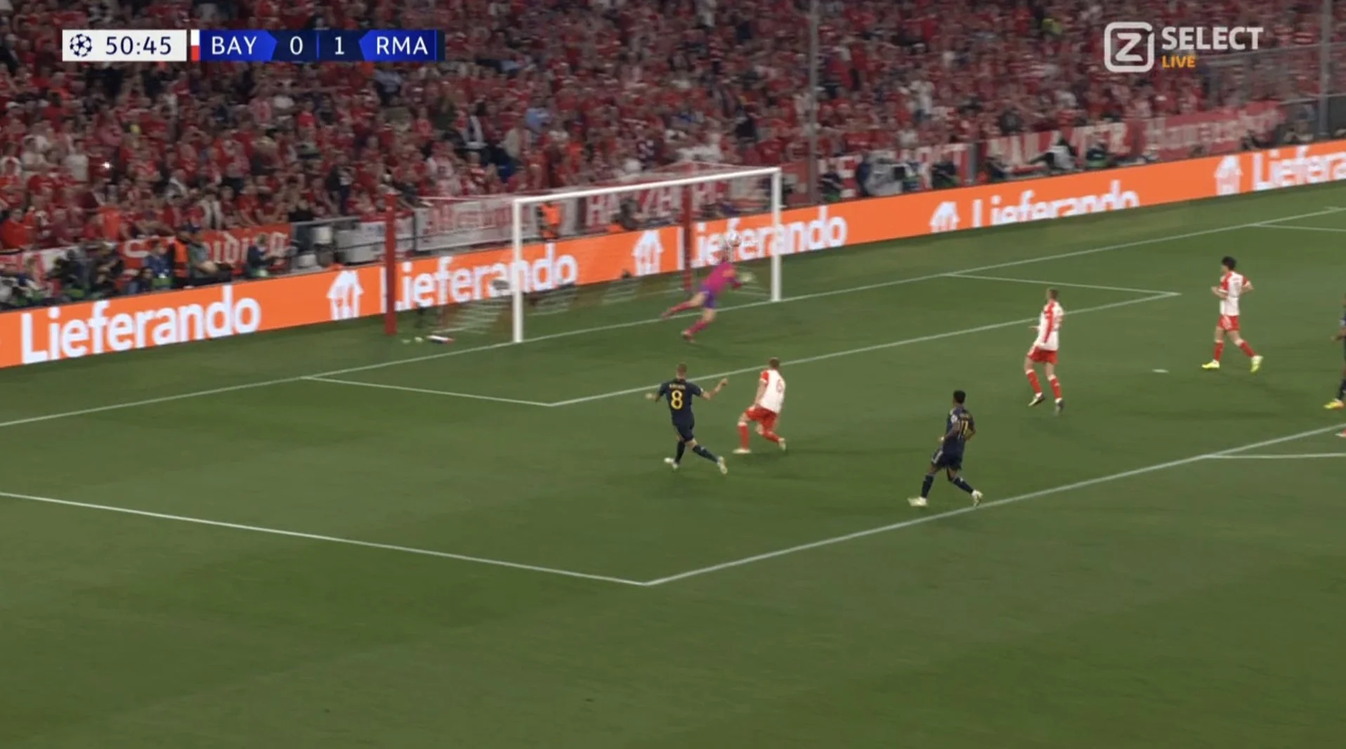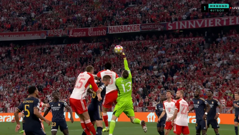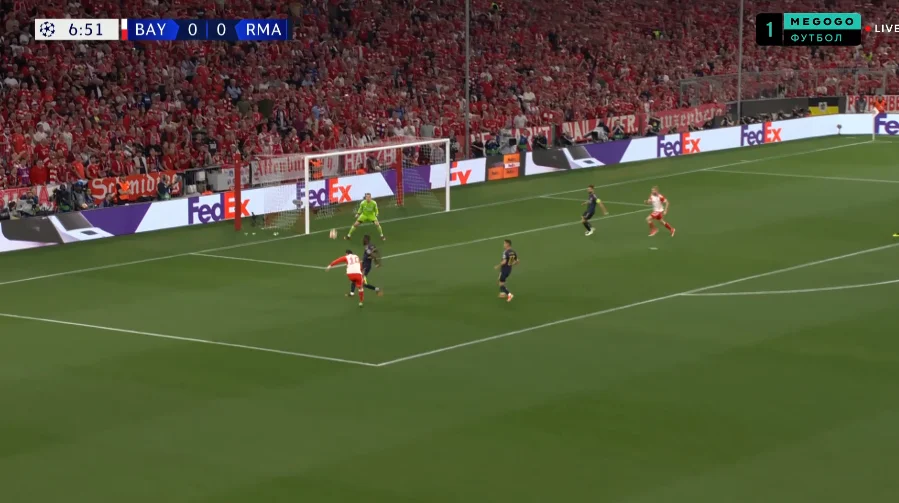 На 6-й Кейн получил пас пяткой от Сане и из пределов штрафной пробил в руки Лунину. Еще через минуту защитники Реала прозевали рывок Лероя, а тот принял проникающий пас и нанес удар с левой половины штрафной. Над ближней девяткой!