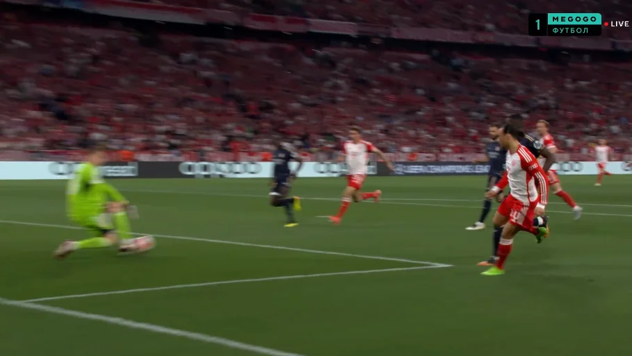 Казалось, что у Баварии все плохо. Тем более неожиданным стал гол мюнхенцев на 53-й – Сане открылся на правом фланге, прошел в штрафную и нанес чрезвычайно мощный удар под ближнюю штангу. Лунин среагировать не успел. 1:1!