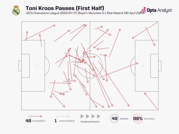 Реал постепенно перехватил контроль над мячом, успокоив игру из-за владения. А затем все чаще стали заметными диагонали Тони. Его влияние усиливалось с каждой минутой. В общем, в первом тайме Кроос отдал 48 передач, 47 из которых оказались точными. 15 – с продвижением сквозь линии.