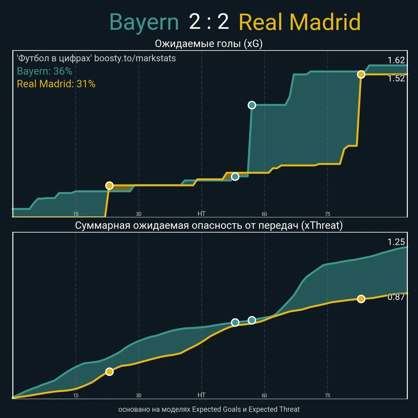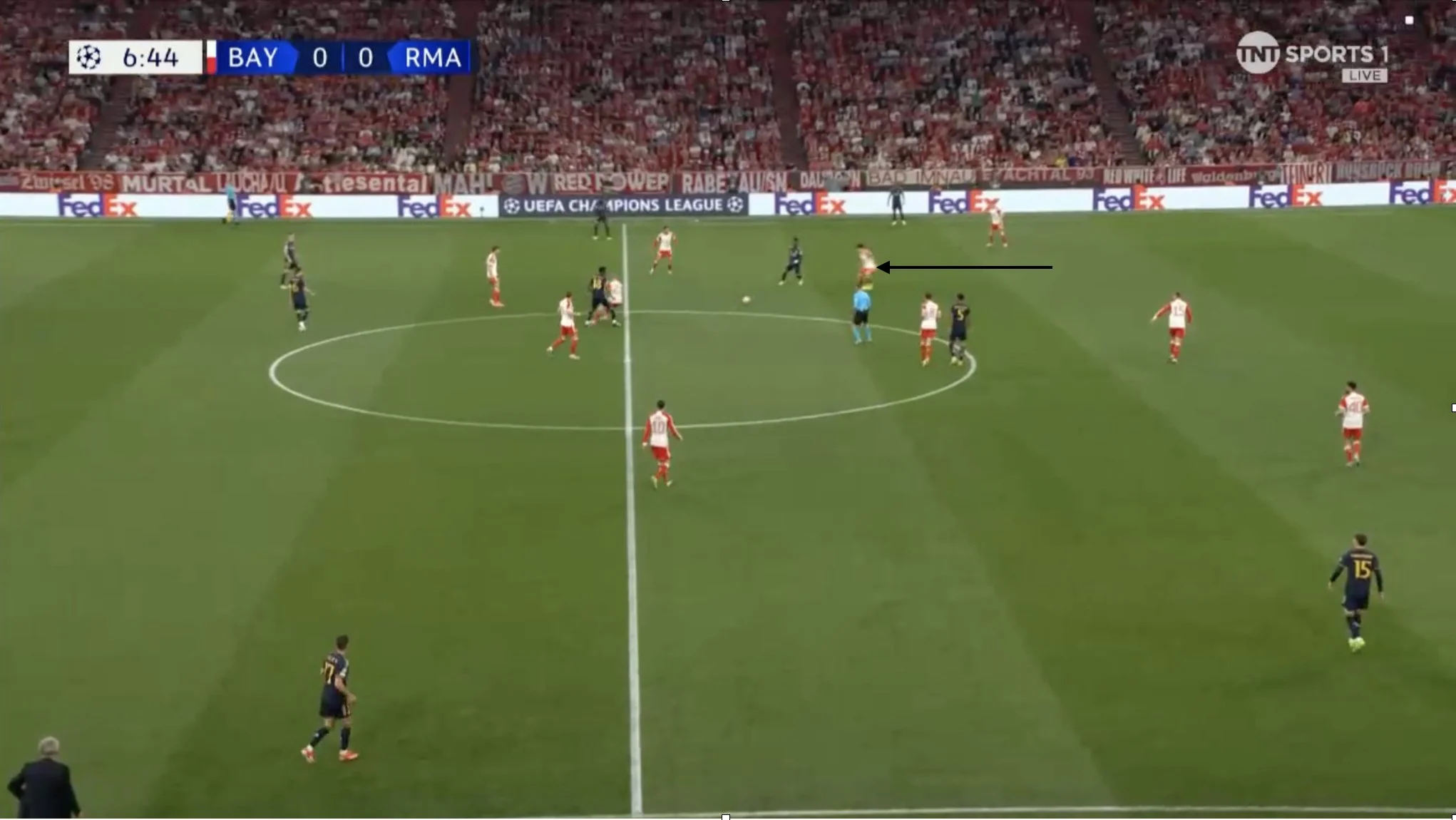 Это был первый и последний момент Реала в первом тайме. До перерыва мадридцы нанесли еще два удара (один со стандарта). Столько же позволили Баварии. Тем не менее, контроль над игрой принадлежал именно испанцам.