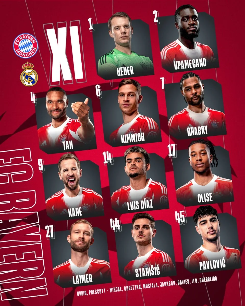 Бавария: Нойер (к.), Станишич, Упамекано, Та, Лаймер, Киммих, Павлович, Олисе, Гнабри, Диас, Кейн.