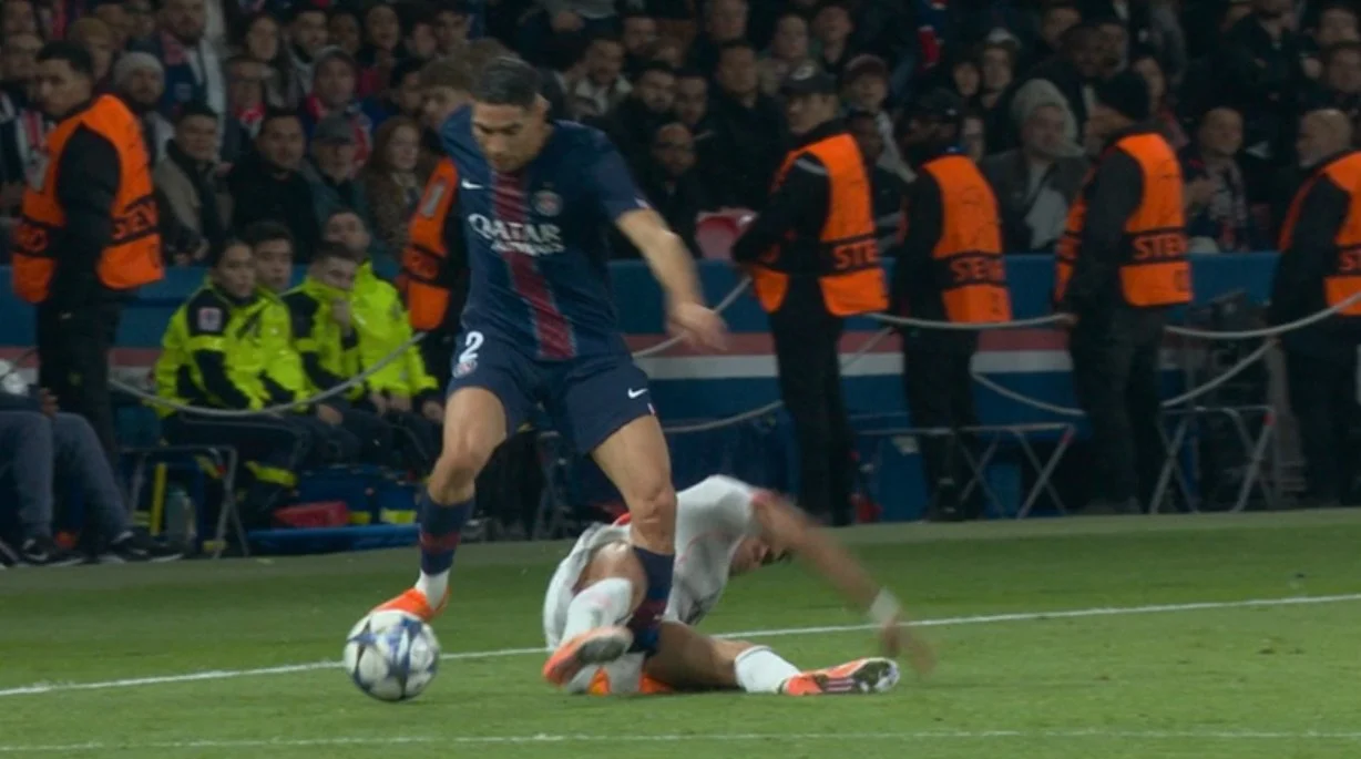 Ашрафа со слезами на глазах под руки вынесли с поля, а судья побежал смотреть VAR и оставил мюнхенцев в меньшинстве, изменив цвет карточки для автора дубля.