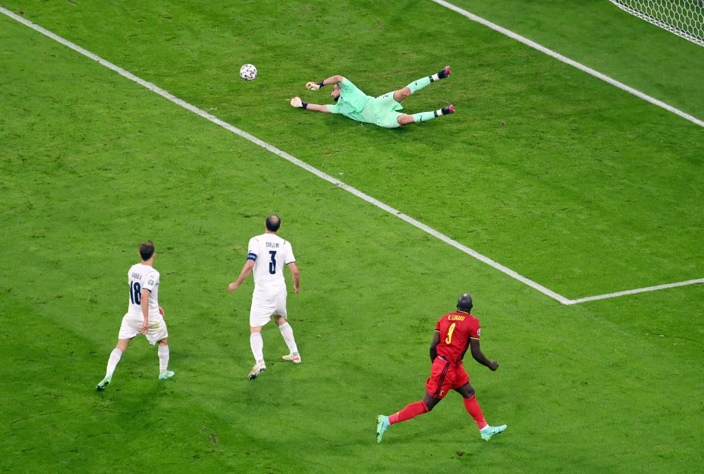 Первые 10 минут поединка команды потратили на разведку, которую прервал неожиданный гол Италии со стандарта. Отличиться удалось Бонуччи, однако взятие ворот отменили из-за явного положения вне игры у Лео и Ди Лоренцо. Этот момент обострил матч: команды обменялись рядом быстрых контрвыпадов, Тилеманс и Верратти обменялись желтыми карточками, а уже на 23-й минуте Бельгия обязана была открывать счет в результате мощного удара де Брюйне с линии полукруга – Доннарумма спас Италию, вытащив мяч из-под левой штанги. В тот же угол на 25-й минуте крутил Лукаку, который ворвался на правый край штрафной, однако и здесь Джиджи парировал.