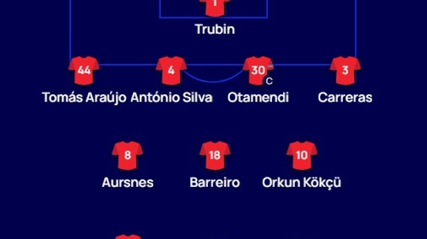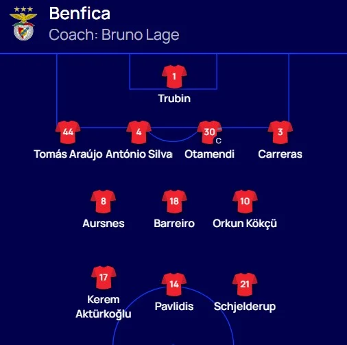 Бенфика: Трубин – Томас Араухо, Антонио Силва, Отаменди, Каррерас – Баррейро, Аурснес – Актюркоглу, Кокчу, Шьелдеруп – Павлидис