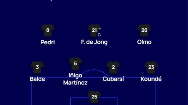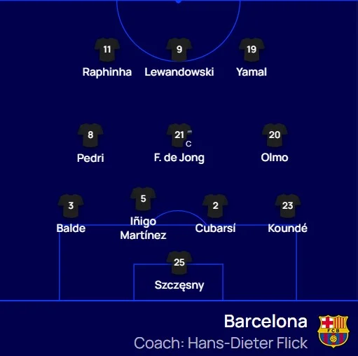 Барселона: Щенсны – Кюнде, Кубарси, Иньиго Мартинес, Бальде – Френки де Йонг, Педри – Ямал, Олмо, Рафинья – Левандовски