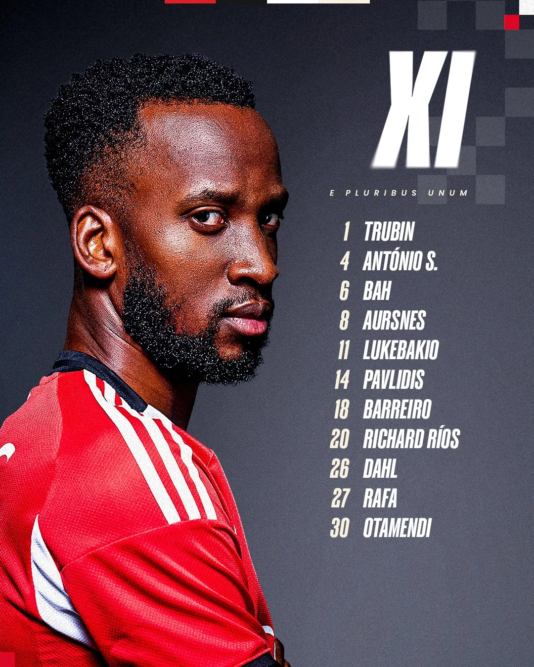 Стартовый состав Бенфики: Трубин, Орснес, Ба, Баррейро, Даль, Лукебакио, Отаменди (к), Павлидис, Рафа Силва, Риос, А. Силва.