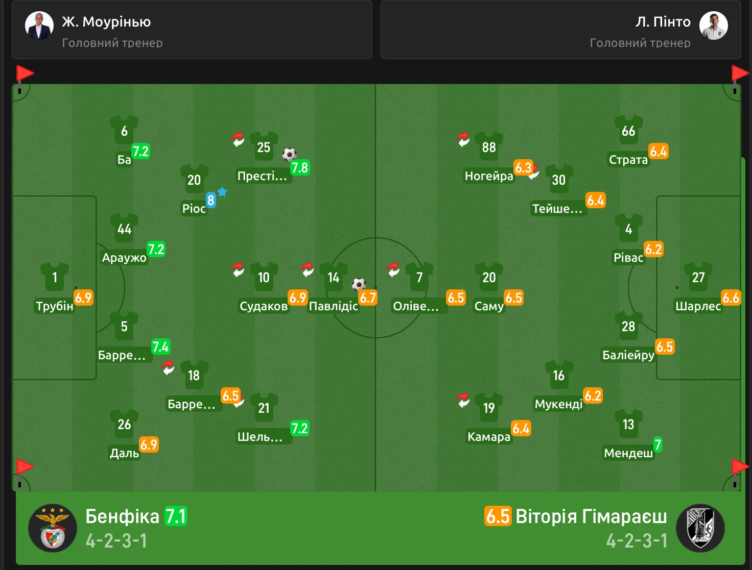 Судаков по итогам встречи получил от матч-центра почетную грамоту Футбол 24 третью самую низкую оценку в составе лиссабонцев – 6.9, у Трубина такой же балл.