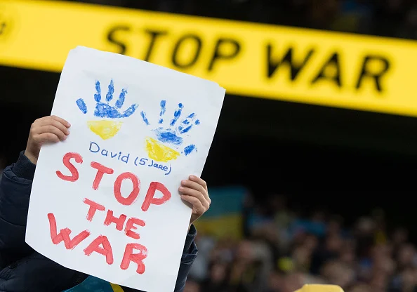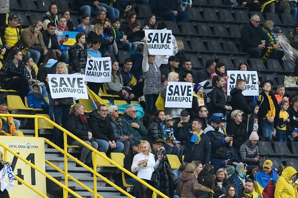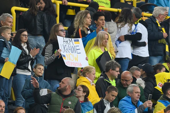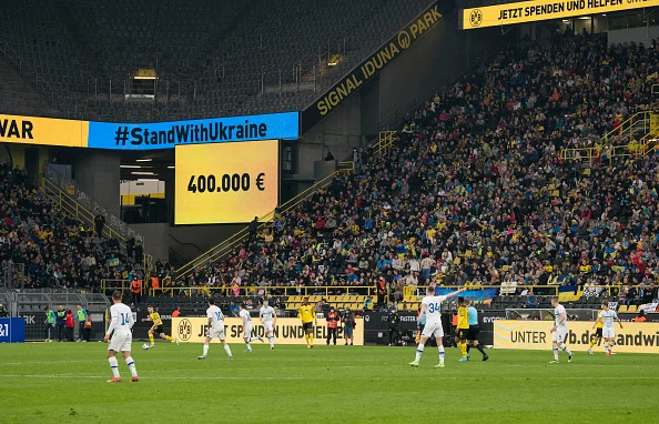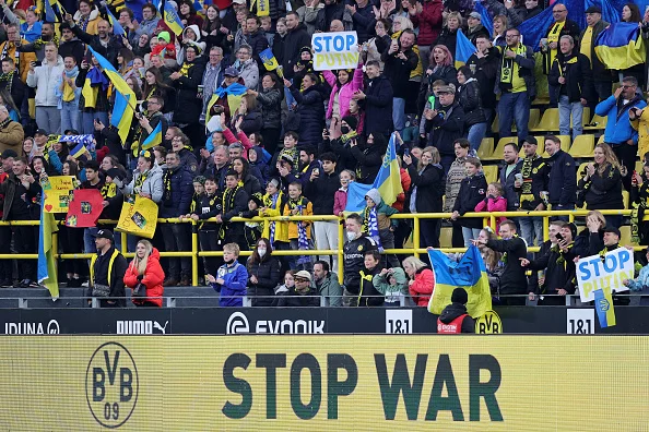 На трибунах массово развевались украинские флаги, а люди поднимали баннеры с призывами остановить войну, дать Украине оружие, спасти Мариуполь. Боруссия ответственно отнеслась к матчу и повысила интерес, выпустив Холанда, Ройса и других звезд команды.